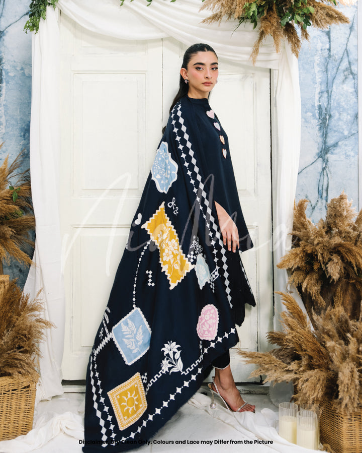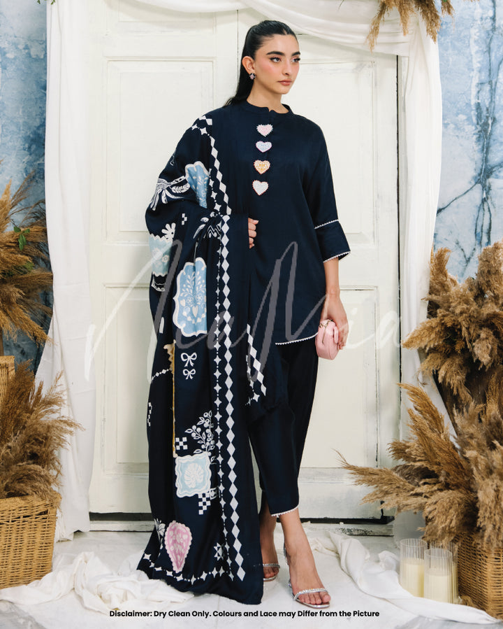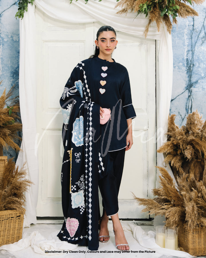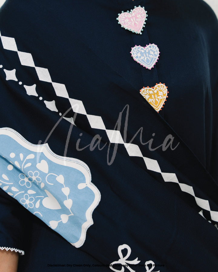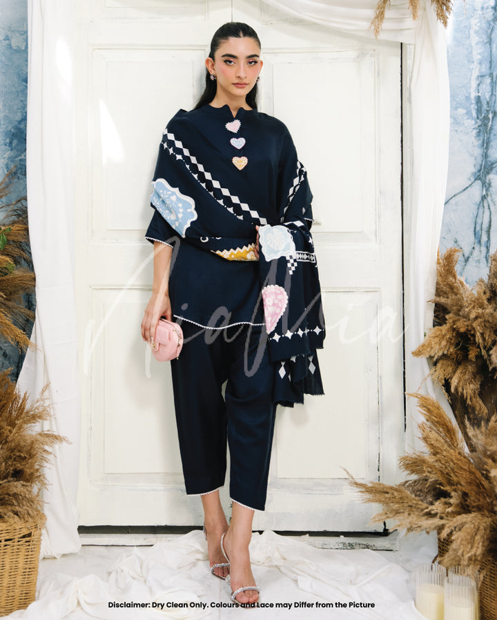A navy blue pashmina two-piece outfit paired with a matching navy shawl decorated with soft pastel heart appliqués and geometric detailing, giving the look a cute yet refined touch.