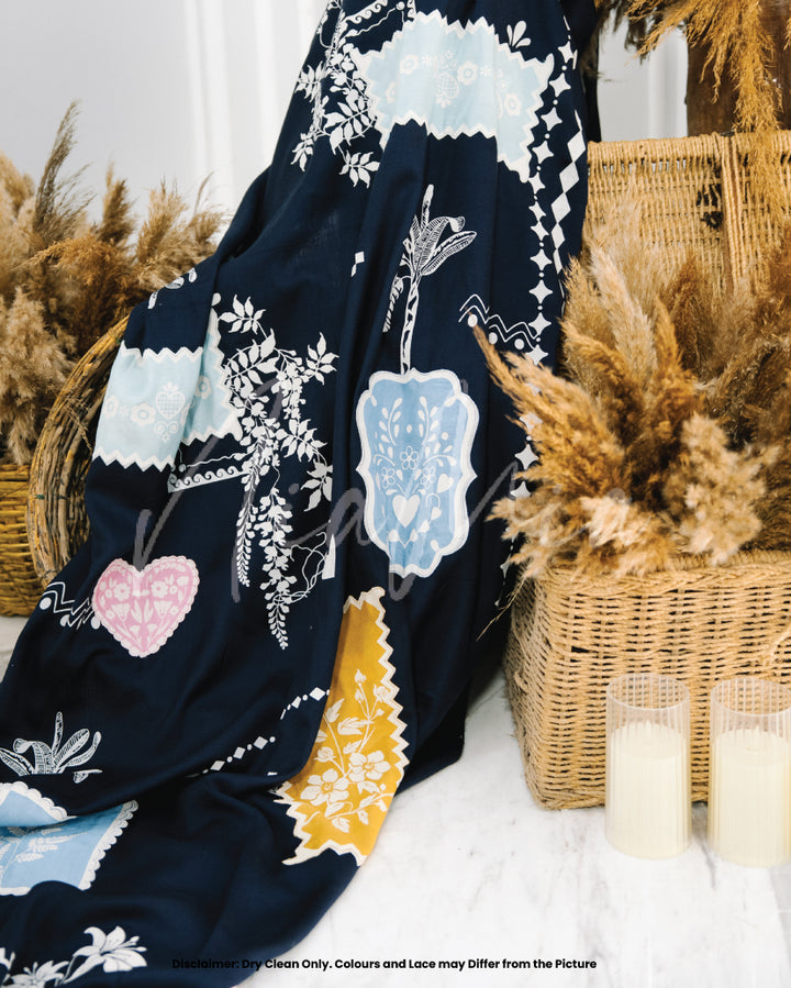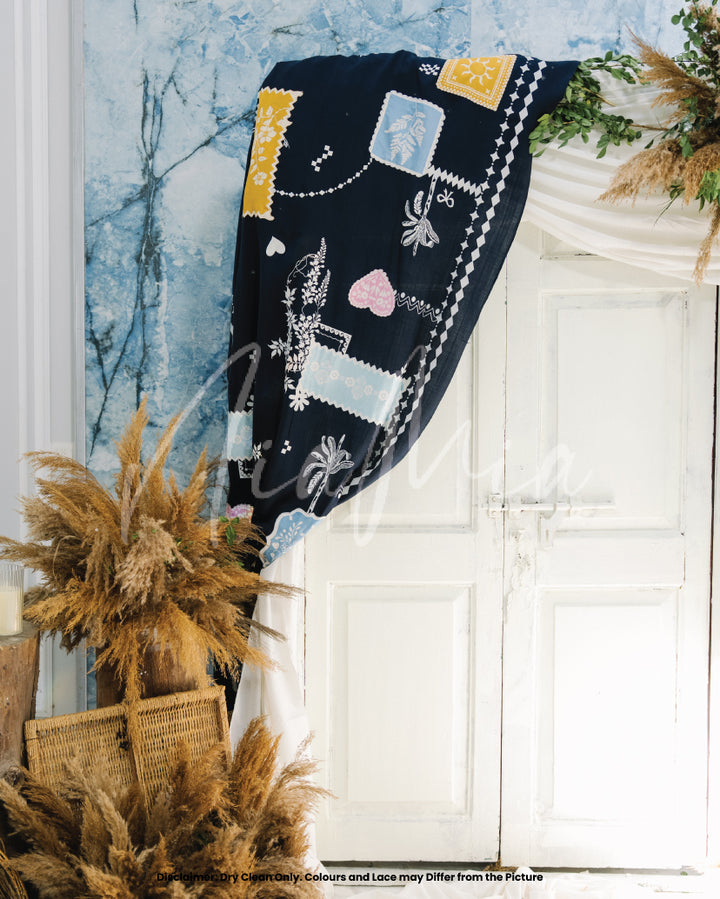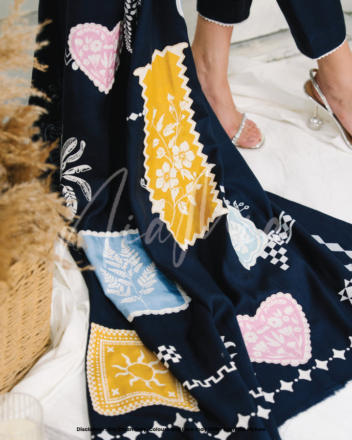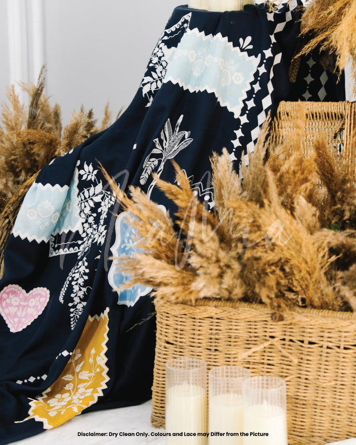 An elegant navy blue pashmina shawl with screenprinted patches all over the body, at 2.75 yards this shawl is perfect to elevate the whole look.