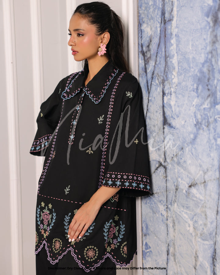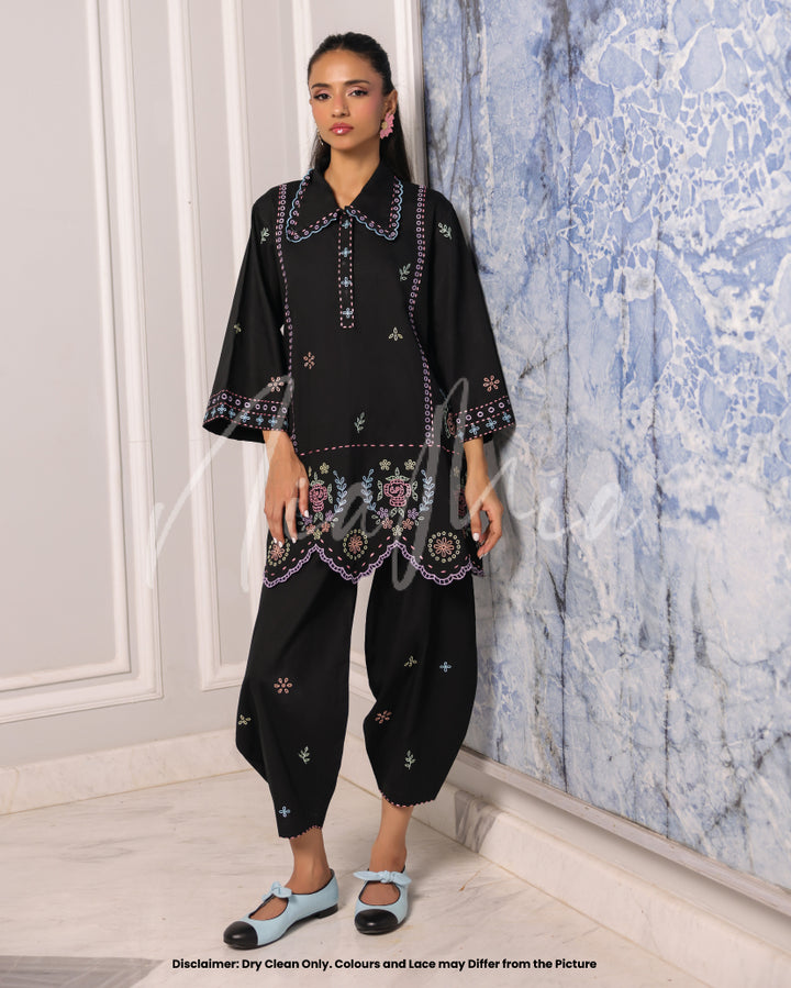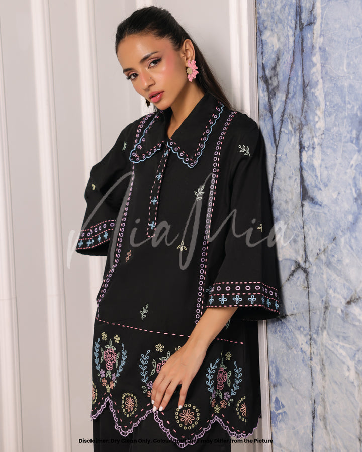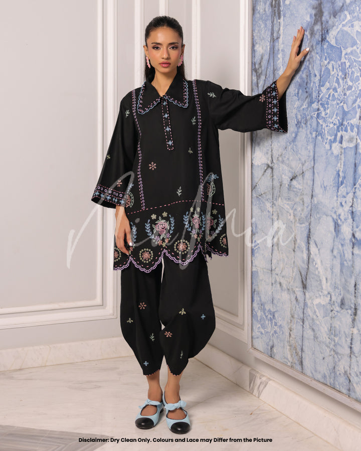 Playful yet polished — Carnival features multicolored embroidery on rich black linen, paired with a statement scalloped hem and balloon shalwar. A bold pick for the season, it balances festive detailing with a flattering silhouette perfect for fall evenings.