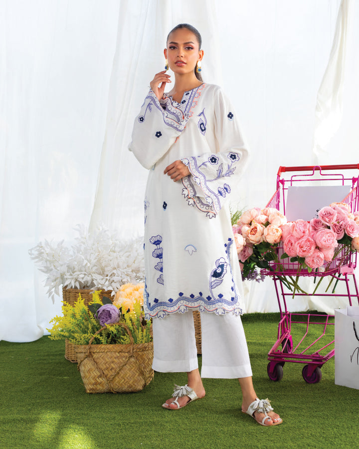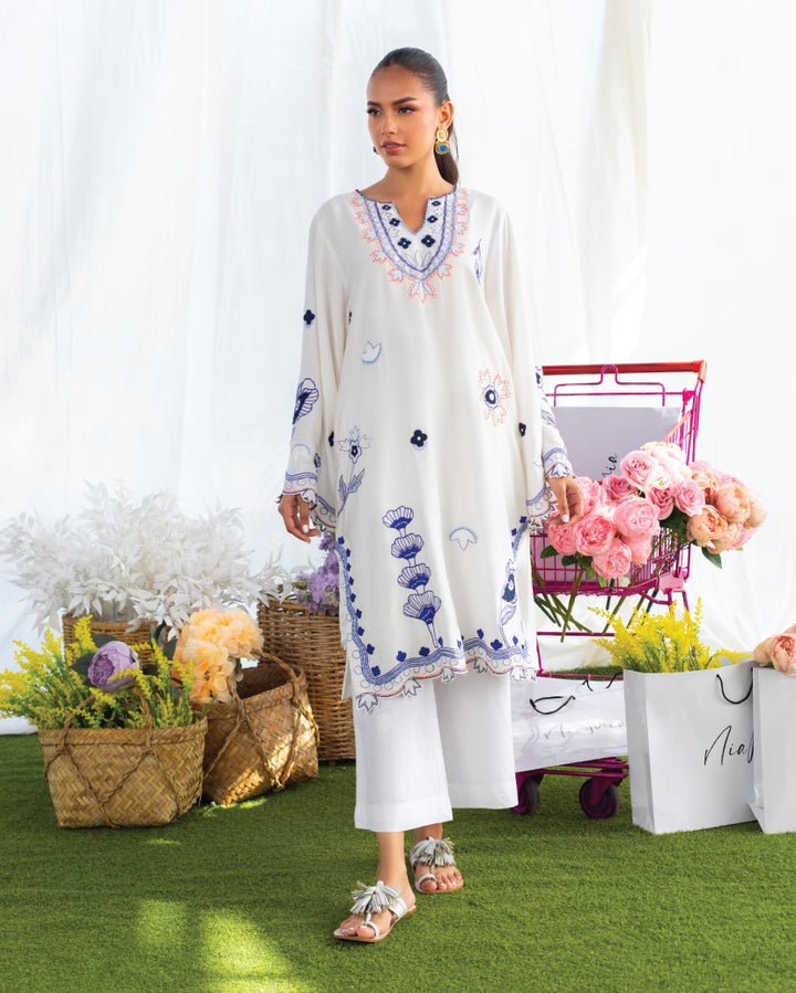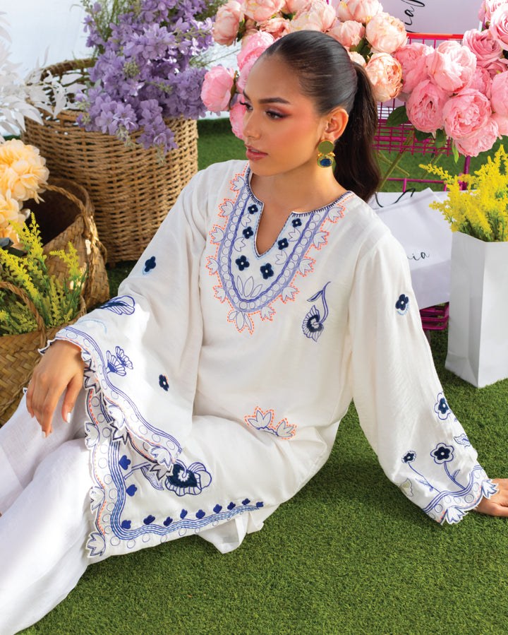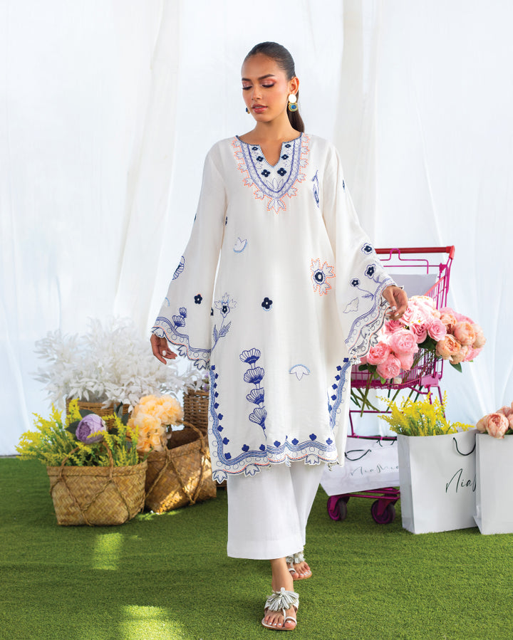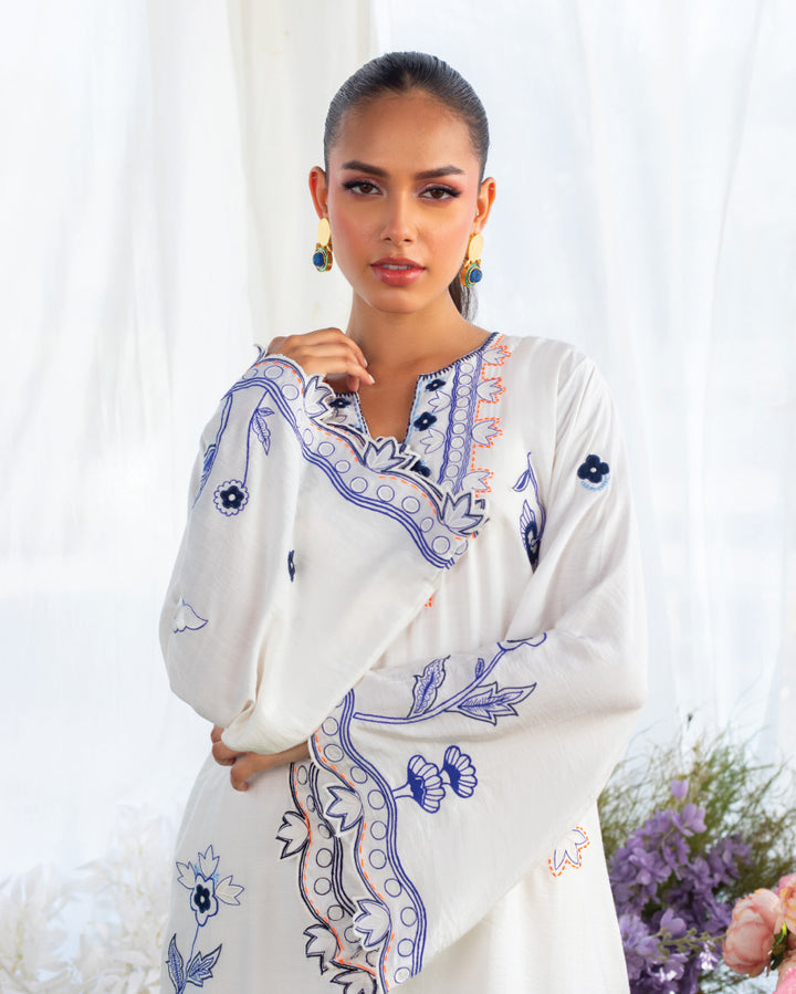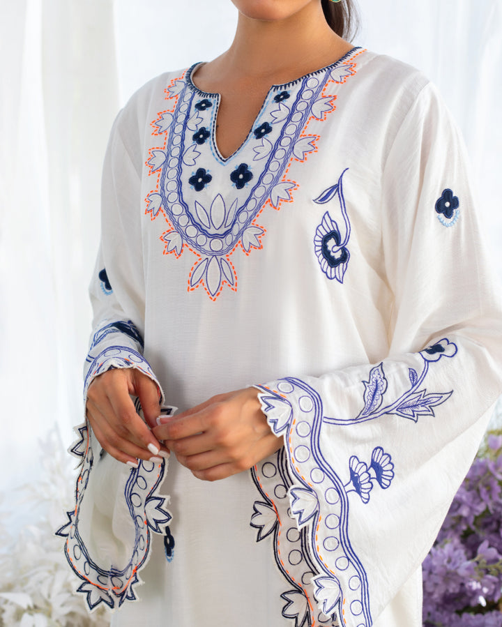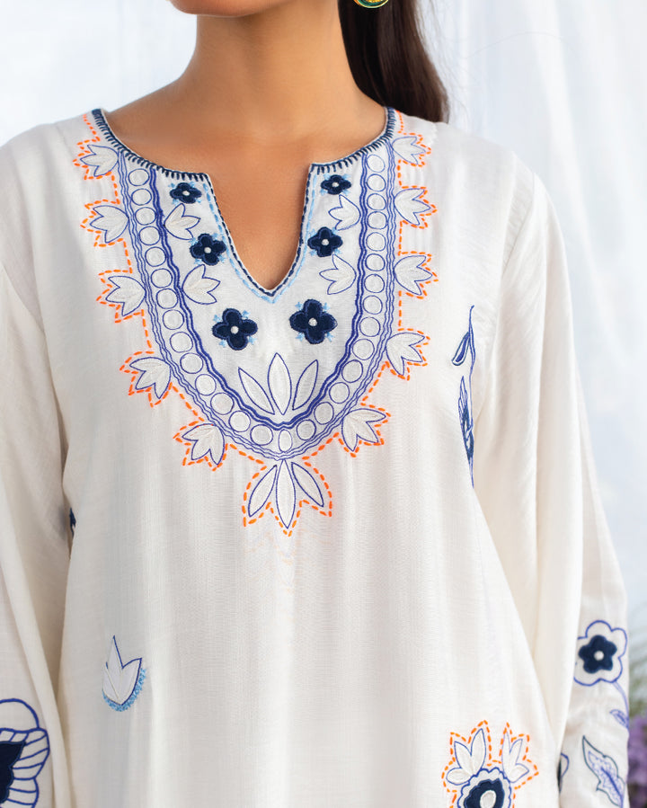 This outfit features a straight kumeez with beautiful embroidery featuring bright orange kantha hand work stitches, the neckline is adorned with embroidered edges along with delicate cutwork.