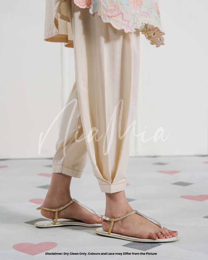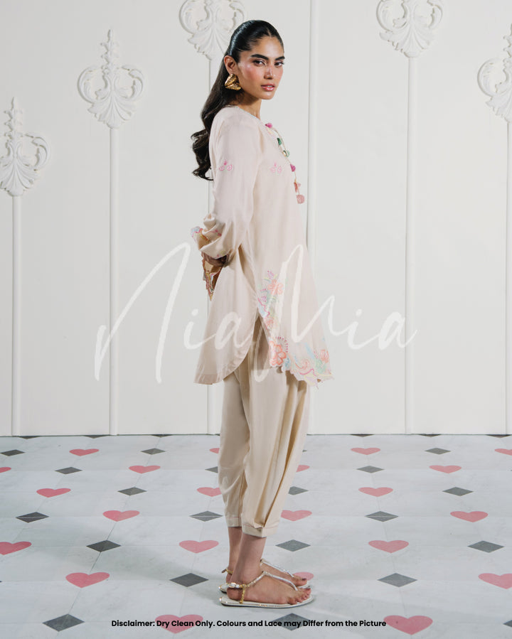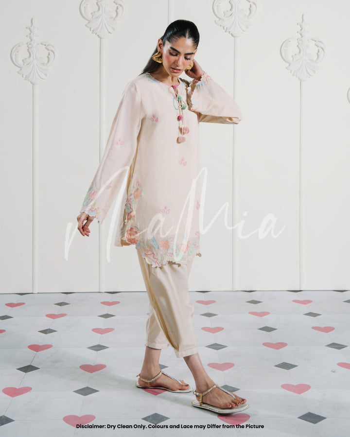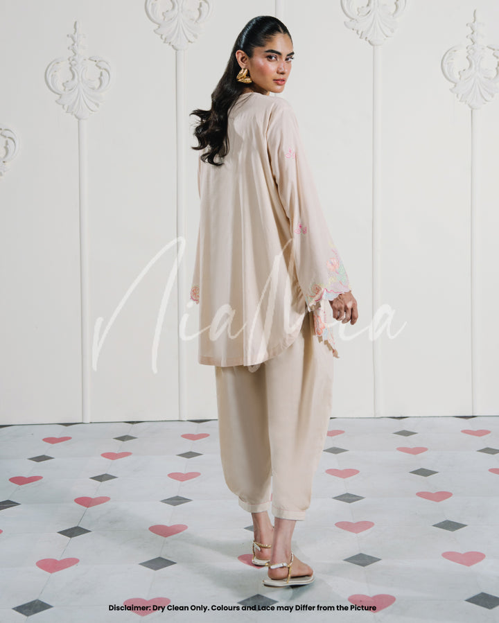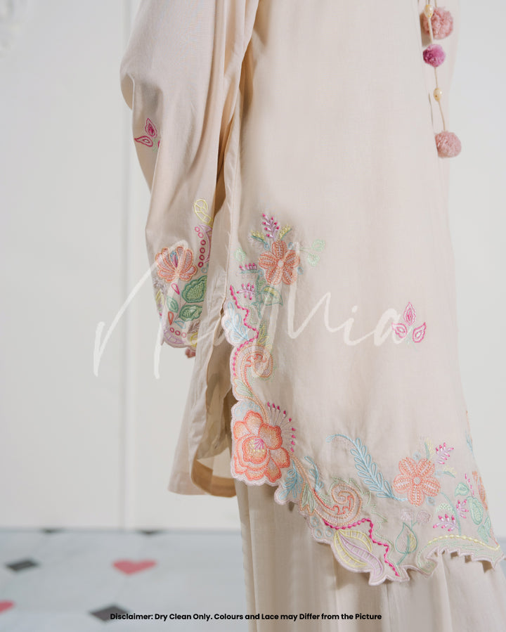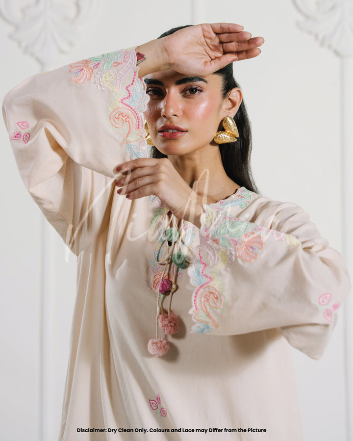 A pastel two-piece lawn set in blush beige, elevated with soft multicolored embroidery and scalloped cutwork. The neckline is accented with subtle tassel ties, while the hem and sleeves are finished with embroidered florals in candy hues. A light, feminine look that carries an understated festive mood.