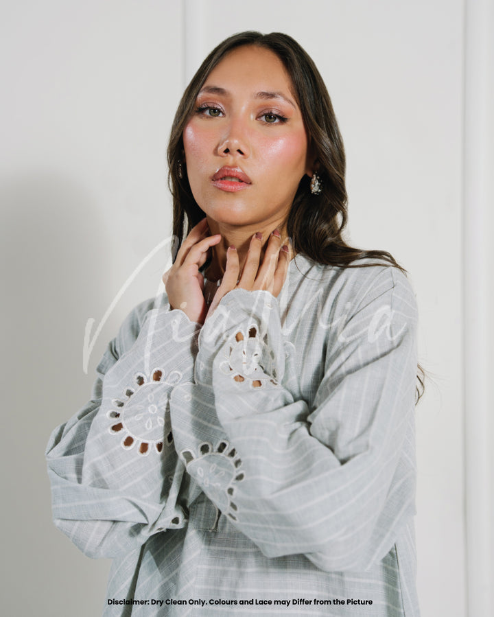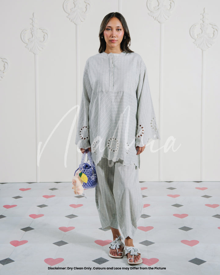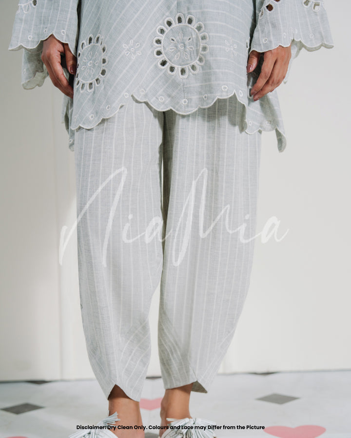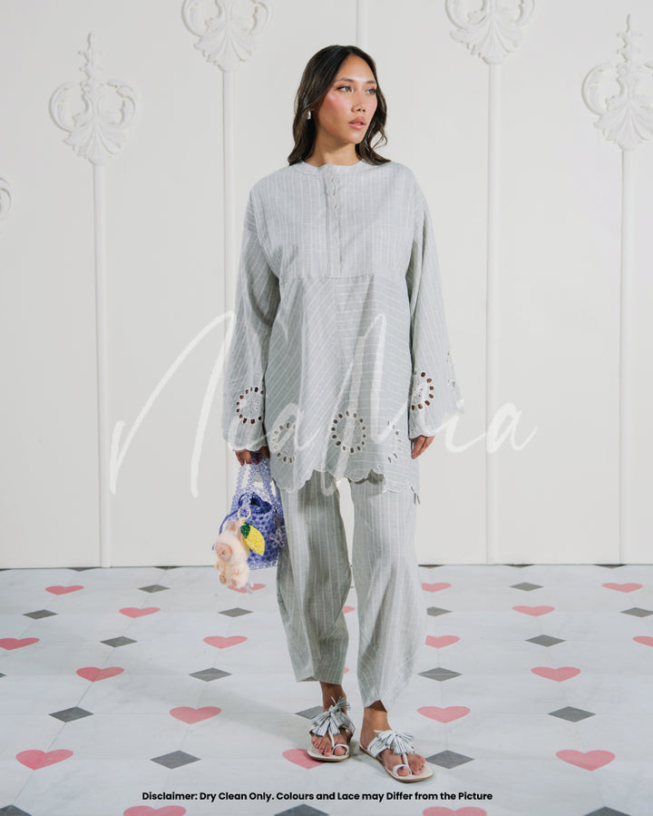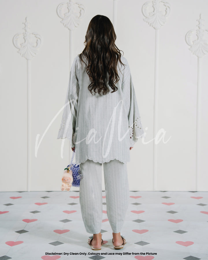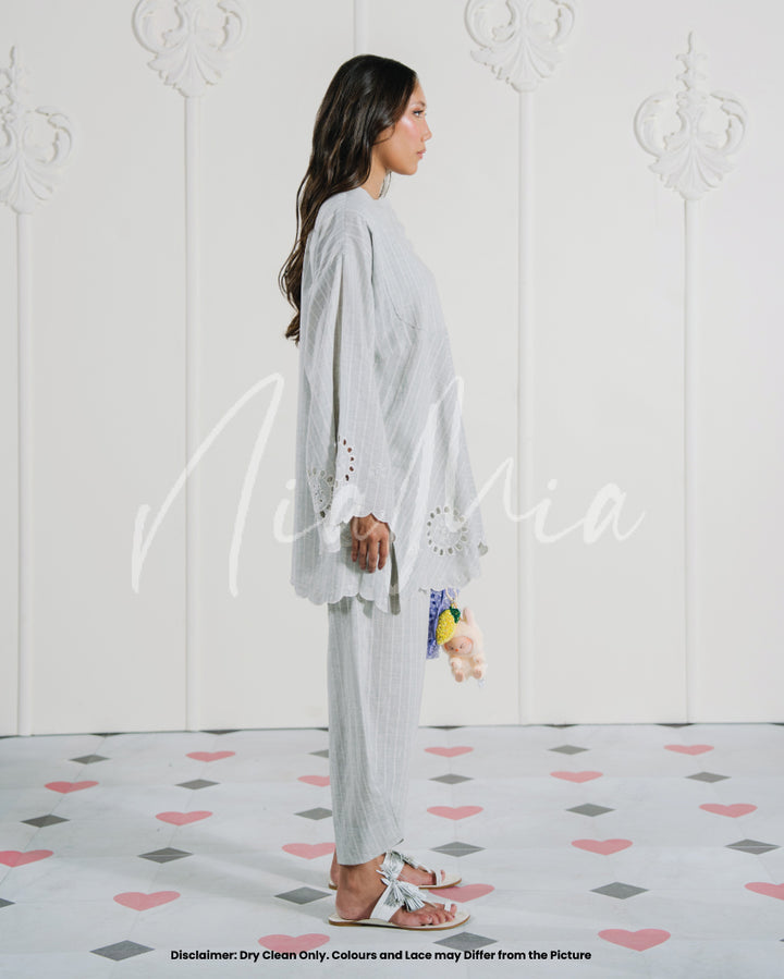 A grey linen weave co-ord set featuring fine white pinstripes and circular cutwork detailing along the sleeves and hem. The kurta has a straight silhouette with a scalloped neckline and a relaxed fit for easy movement.