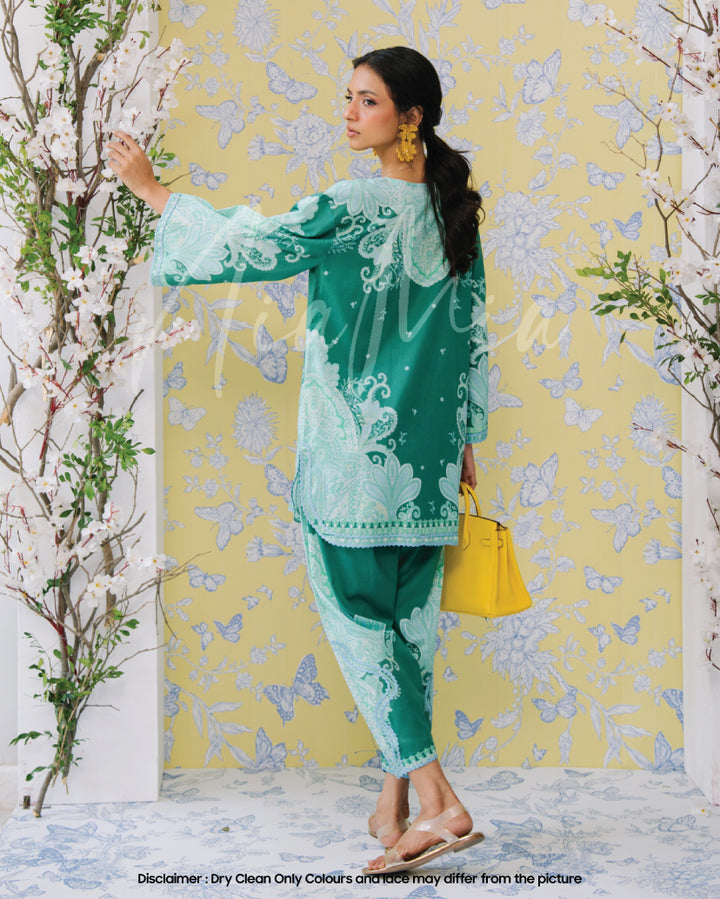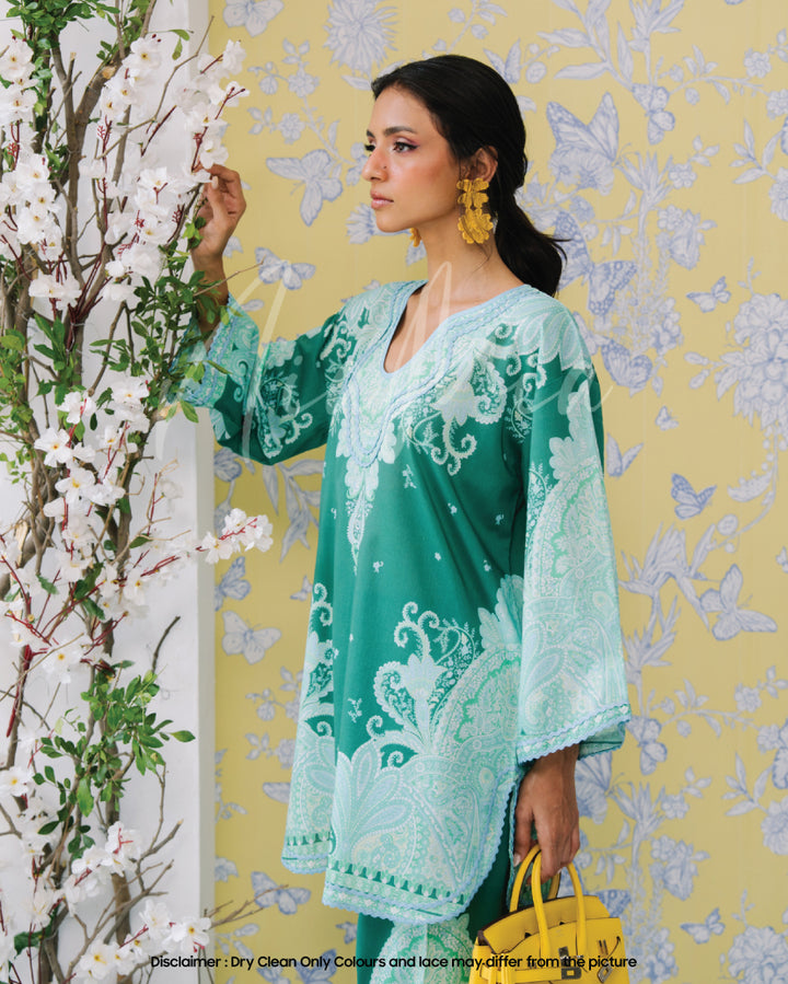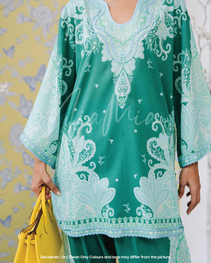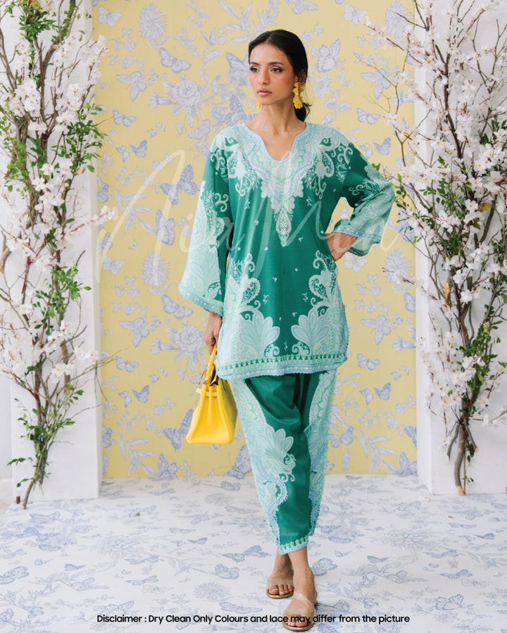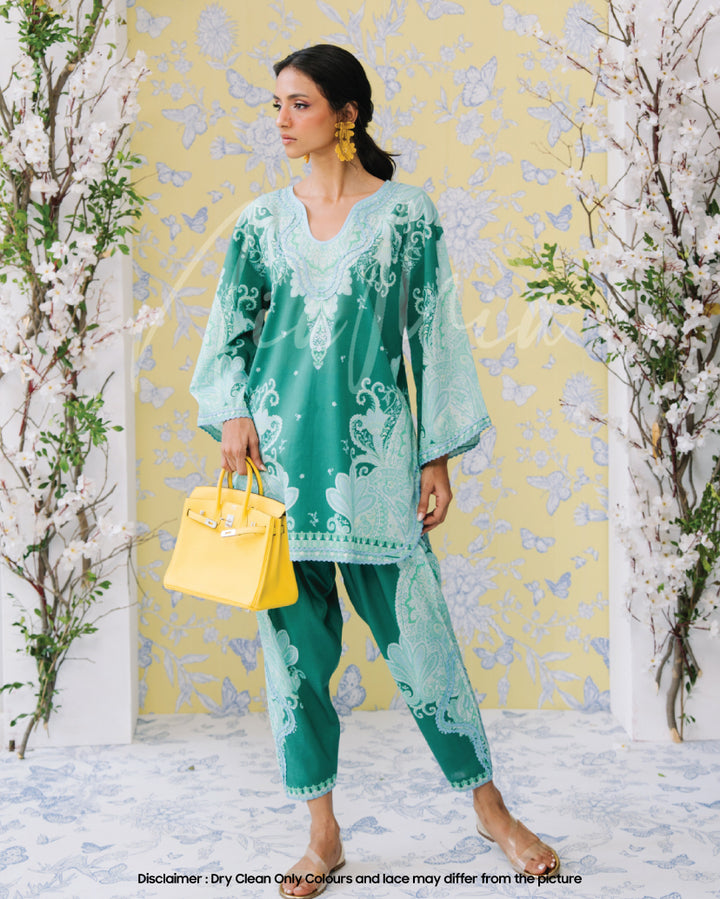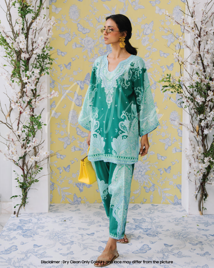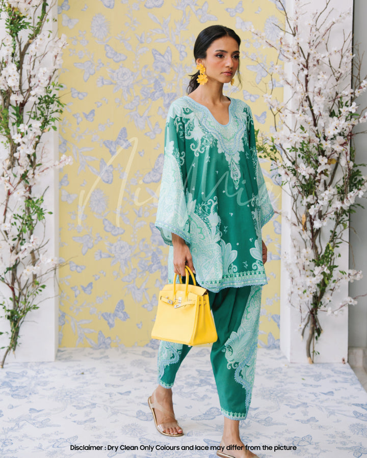 Graceful and grounded, this article is a celebration of serene elegance. 🌿✨This rich emerald green ensemble features a relaxed silhouette adorned with intricate white print.Â