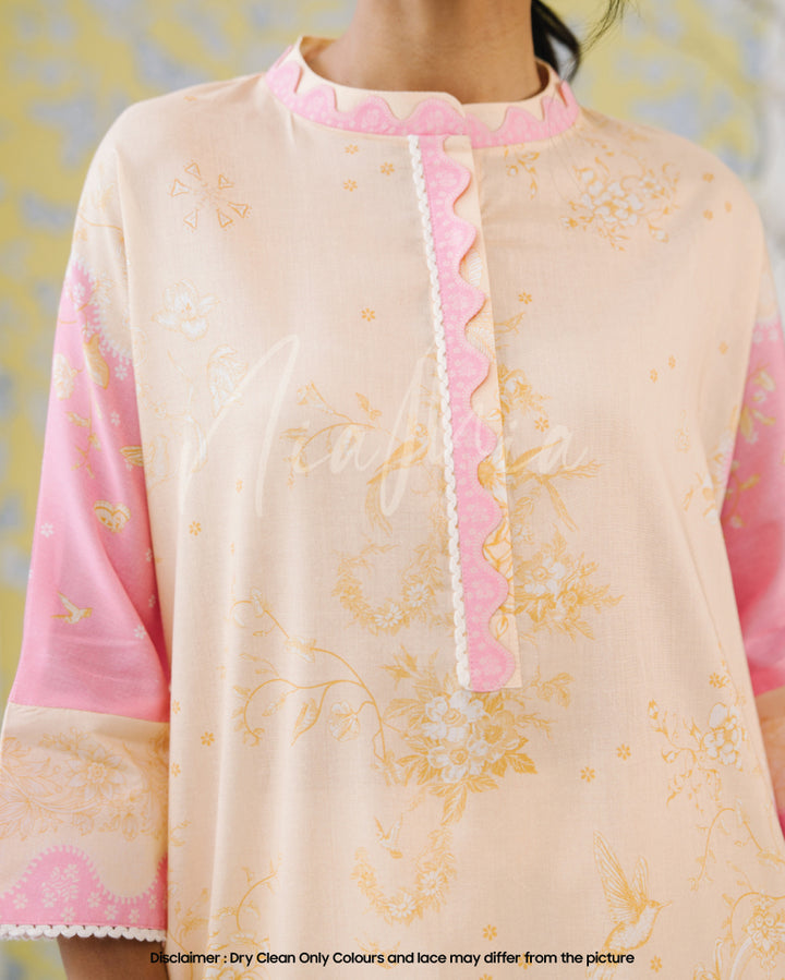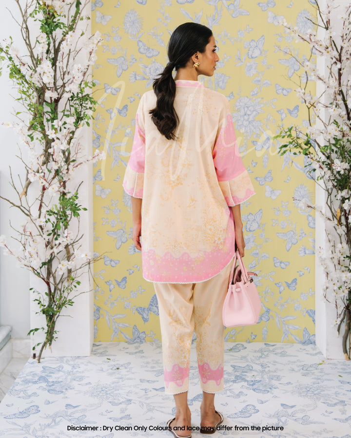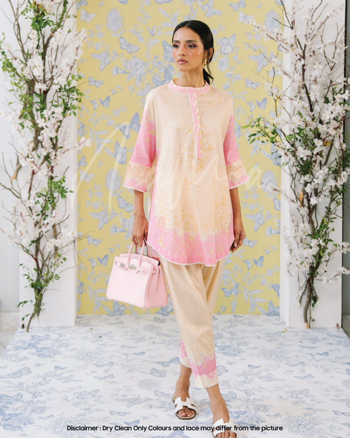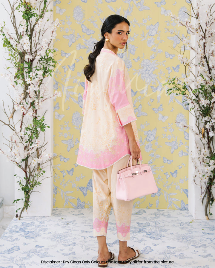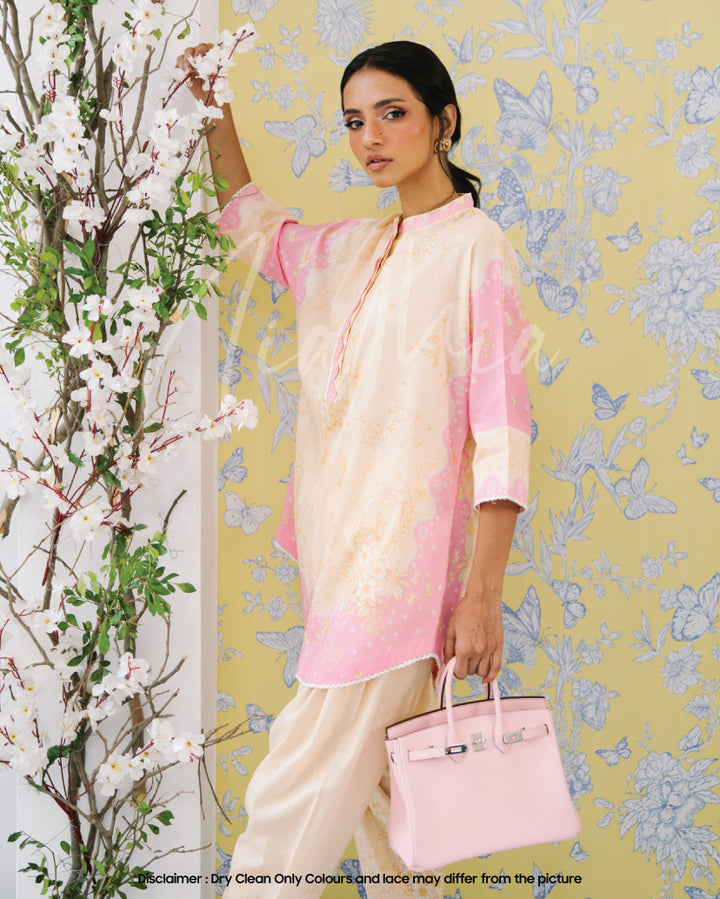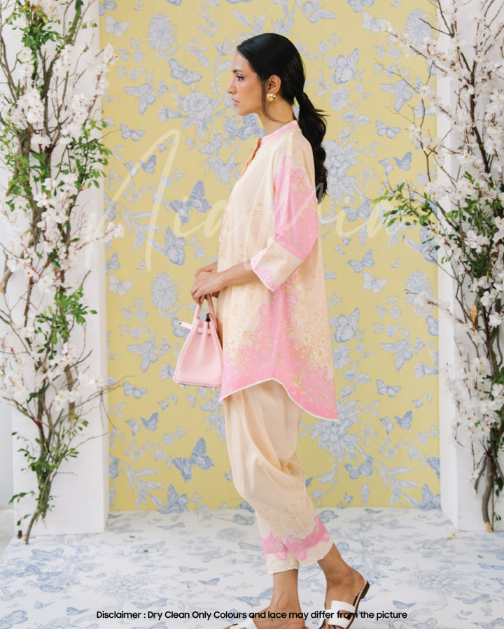 The kurta features a high rounded neckline with delicate button detailing, leading into an enchanting print that gently transitions from light floral sprays to a scalloped pink border with ornamental accents.Â