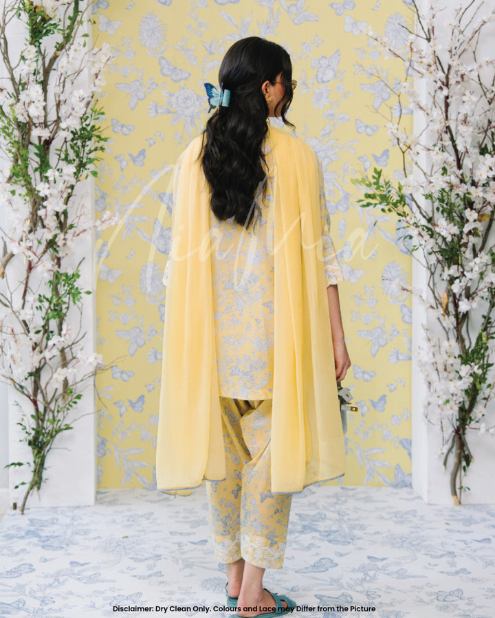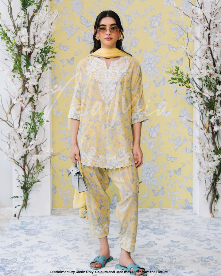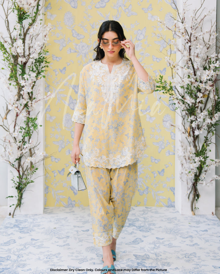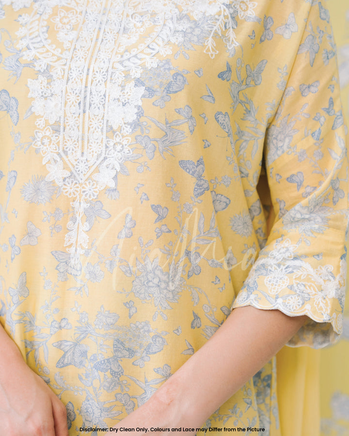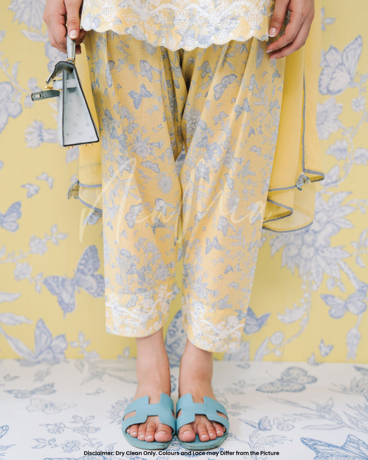 Crafted in a refreshing pastel yellow, this outfit features delicate blue floral prints 🌿💙 complemented by intricate white lace detailing along the neckline, hem, and sleeves 🧵🌾.