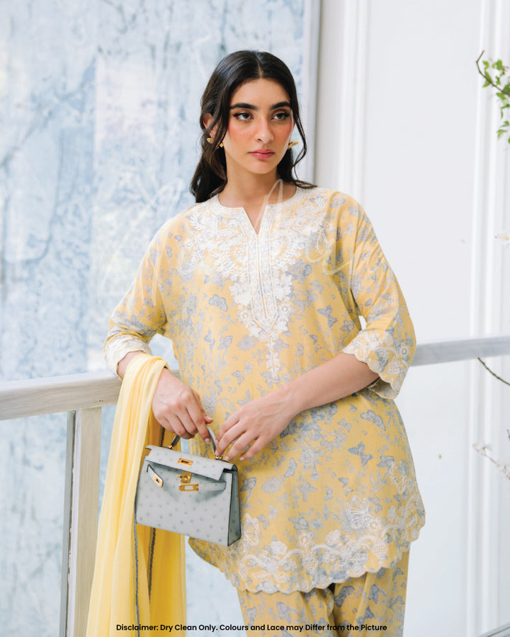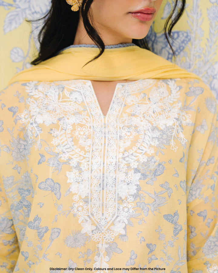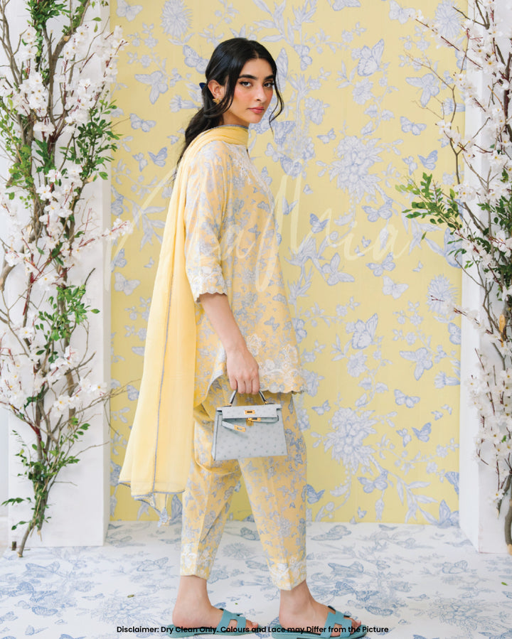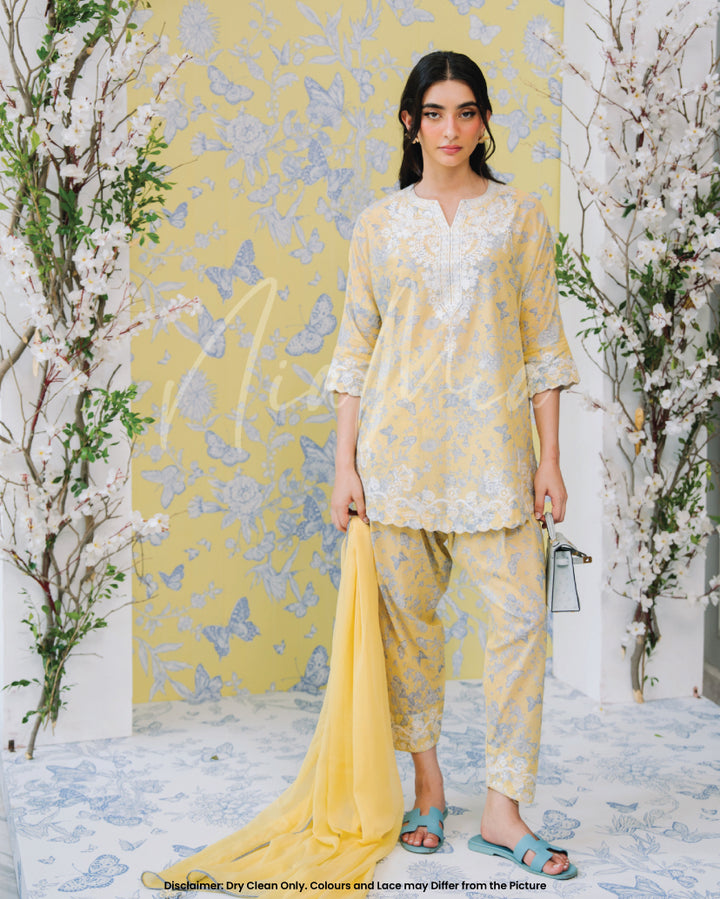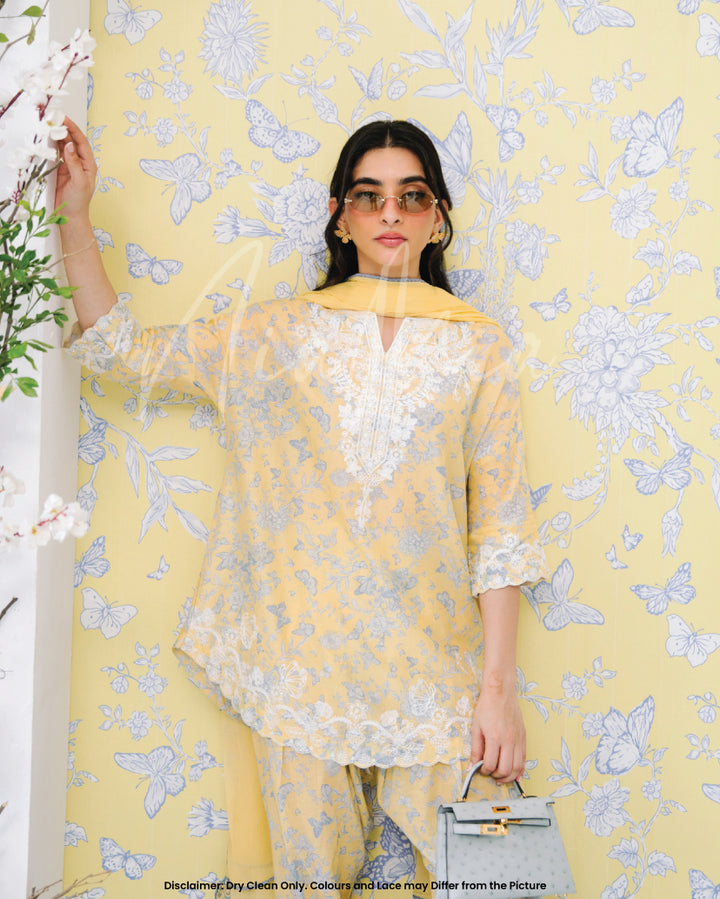 Crafted in a refreshing pastel yellow, this outfit features delicate blue floral prints 🌿💙 complemented by intricate white lace detailing along the neckline, hem, and sleeves 🧵🌾.