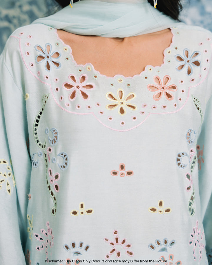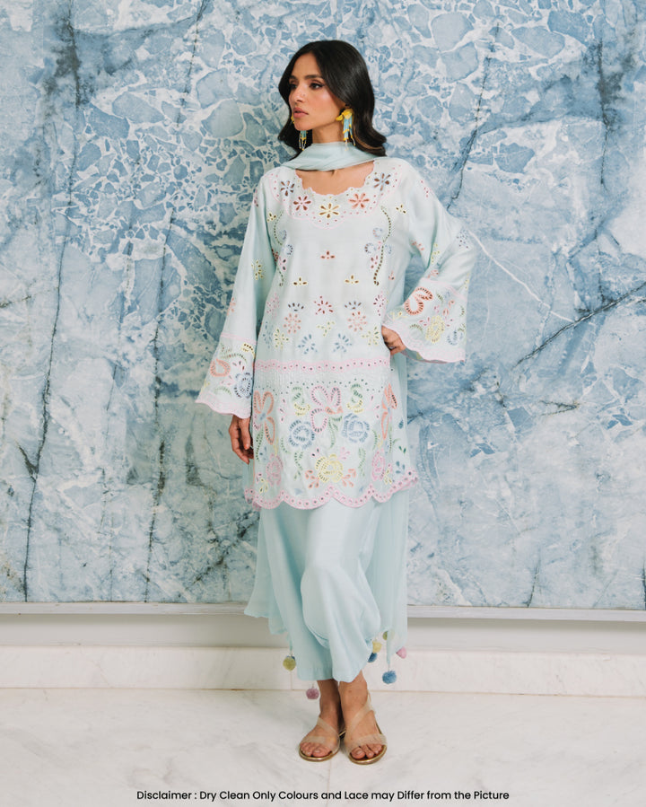 A refined soft blue khaadi silk cutwork kumeez, elegantly enhanced with pastel embroidery.