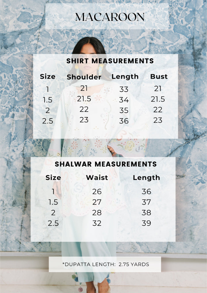 The pants are crafted from luxurious bosky silk, featuring a stylish barrel cut. This ensemble is completed with a chiffon dupatta, adorned with playful pastel pom-pom hangings, adding a charming and whimsical touch to the overall look.