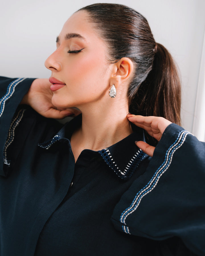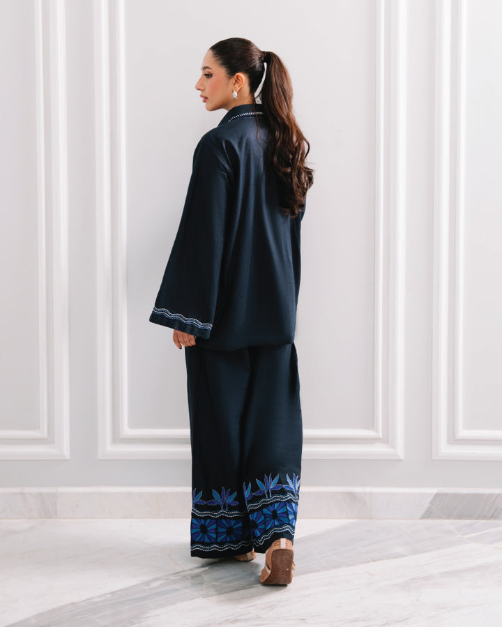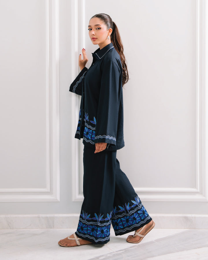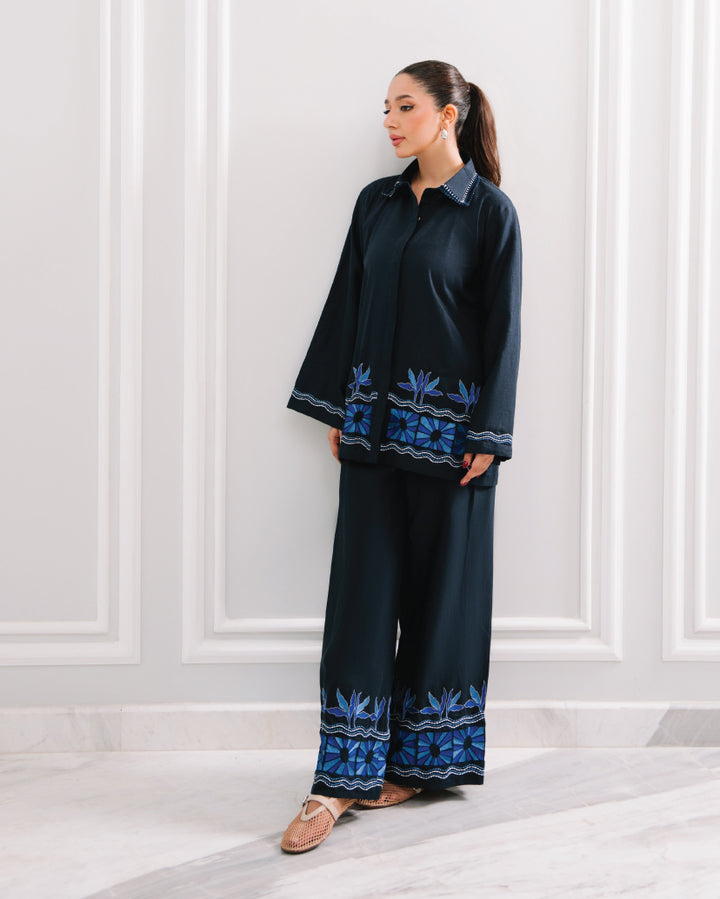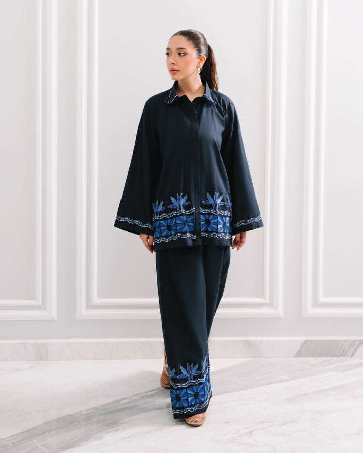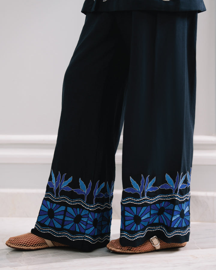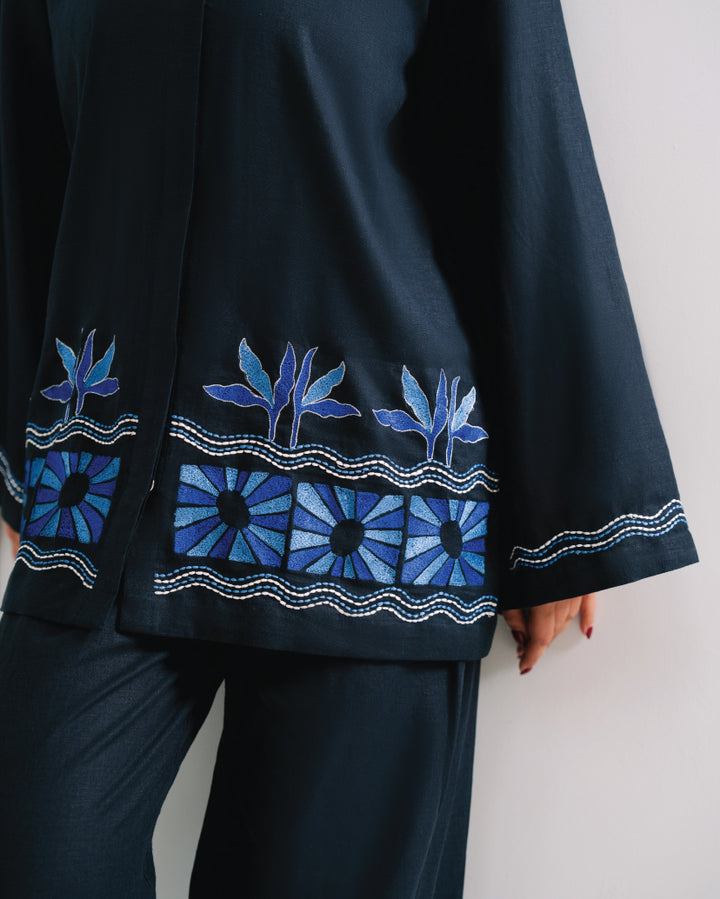 This shirt is crafted from 100% Irish linen. This set features a button down shirt and a collar, along with abstract embroidery along the hem. The pant is cut from the same material adorned with embroidery along the edges