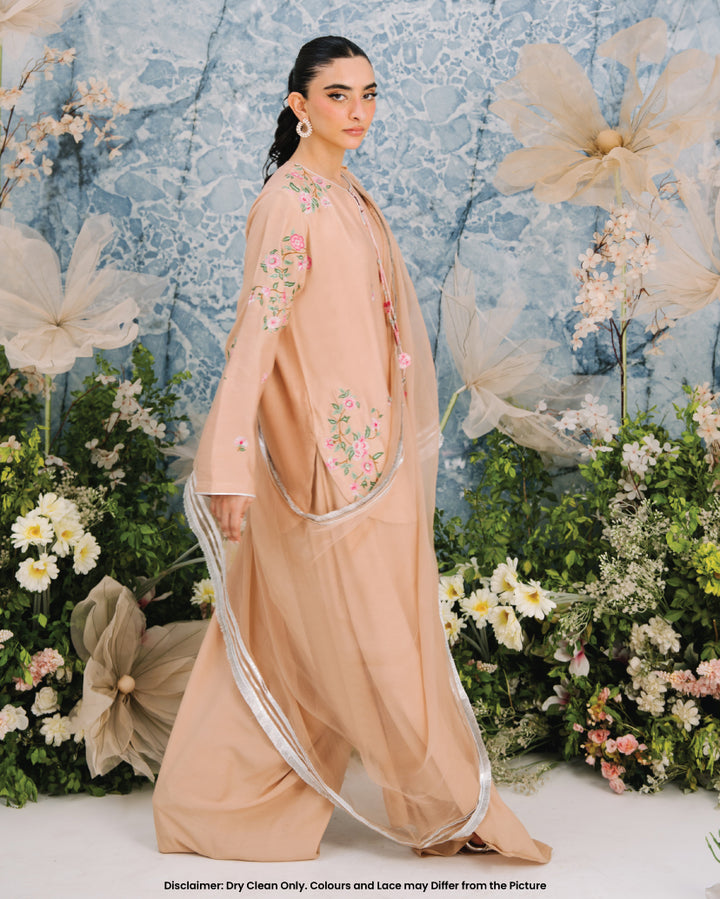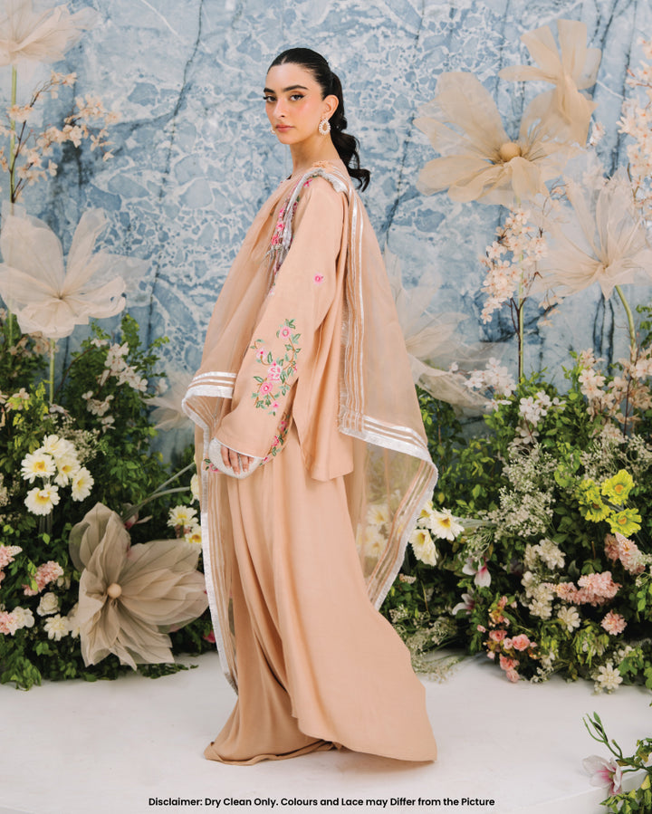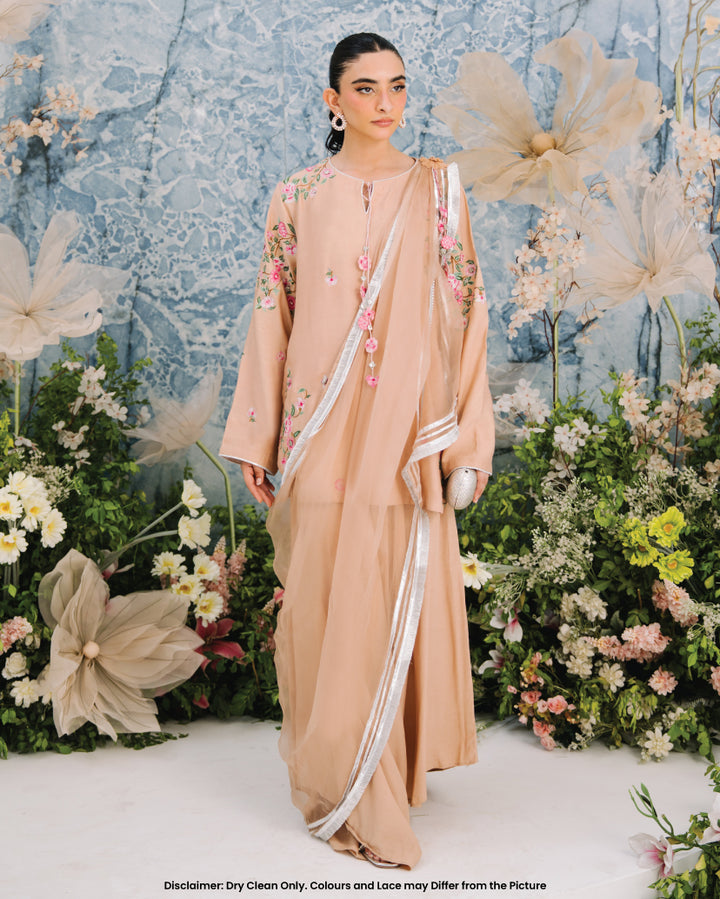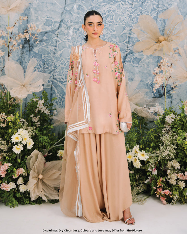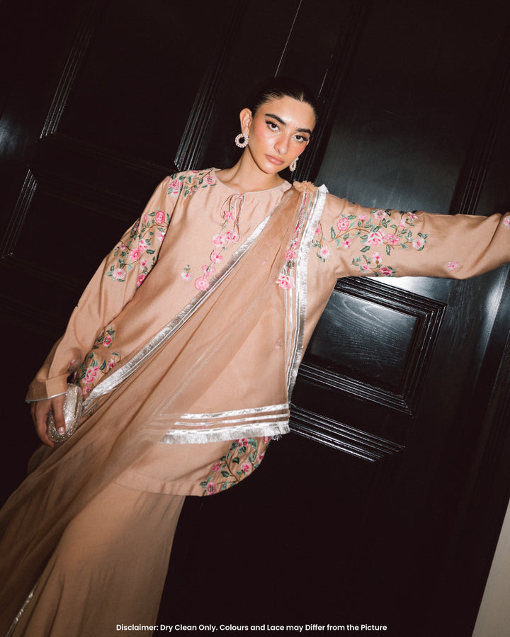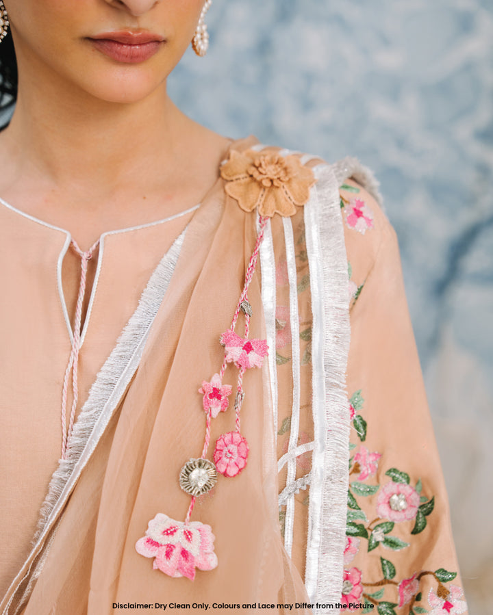 The outfit comes with an attached dupatta, creating a seamless, graceful look. It can be worn sideways or over the shoulder. The neckline is beautifully adorned with lace finishing and playful tassels, adding a touch of charm to elevate the entire ensemble.