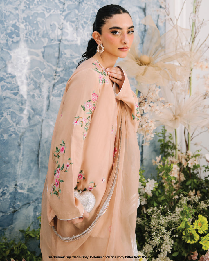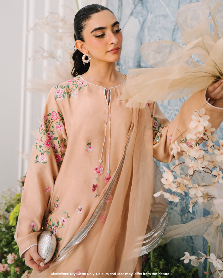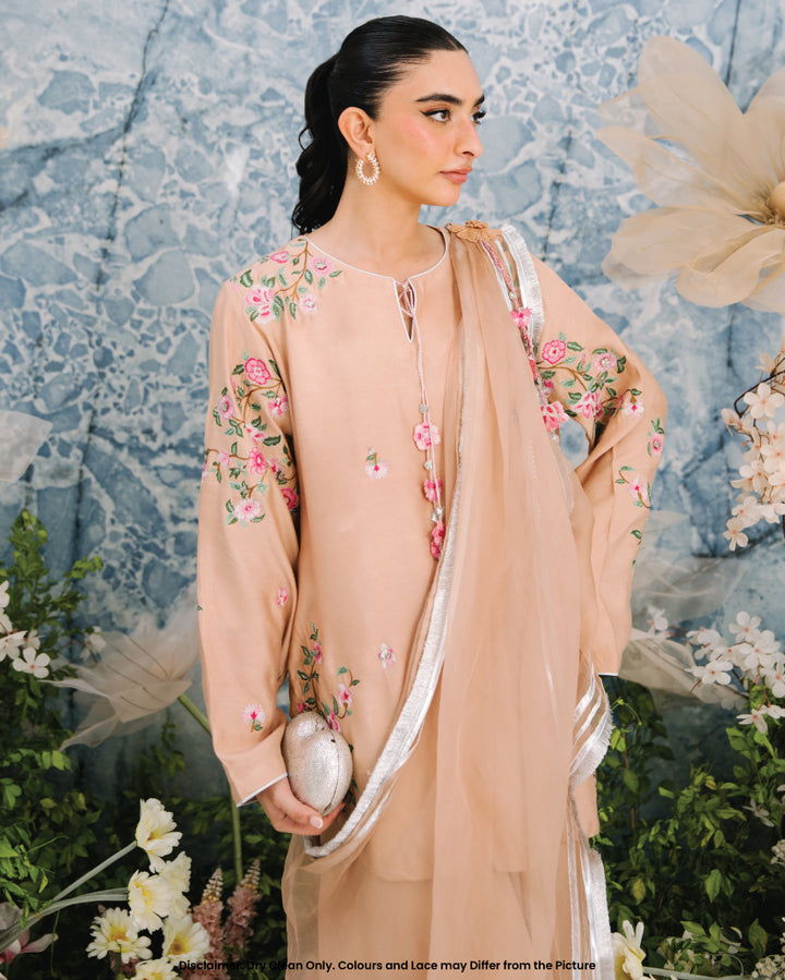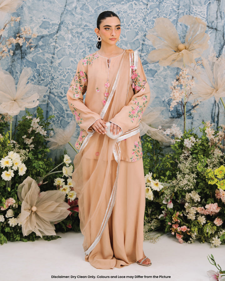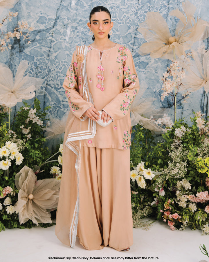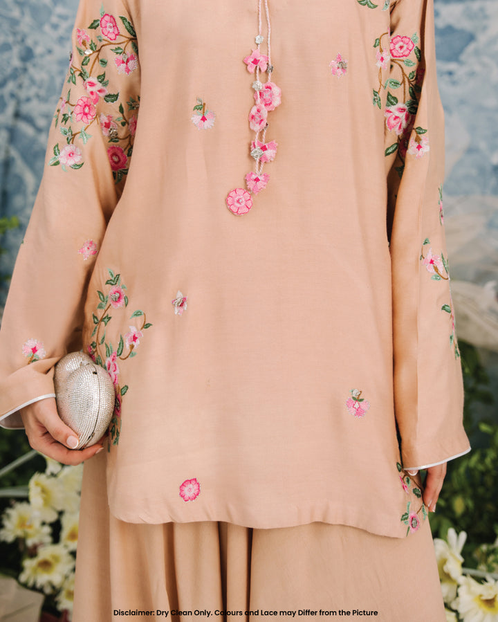 The outfit comes with an attached dupatta, creating a seamless, graceful look. It can be worn sideways or over the shoulder. The neckline is beautifully adorned with lace finishing and playful tassels, adding a touch of charm to elevate the entire ensemble.