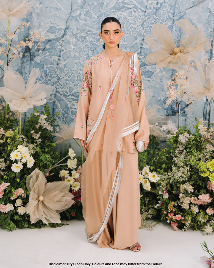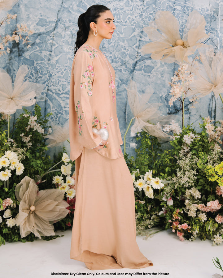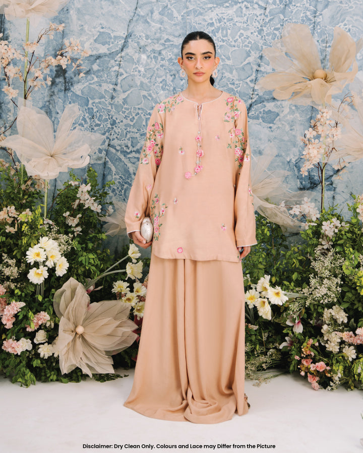 A refined khaadi silk ensemble featuring embroidery and crepe boxy flared pants.