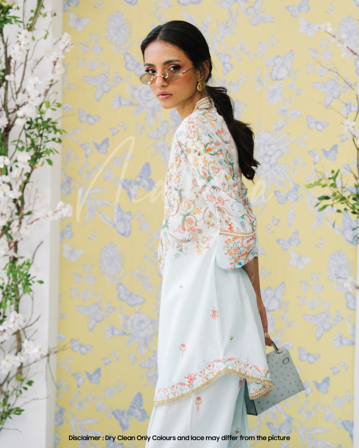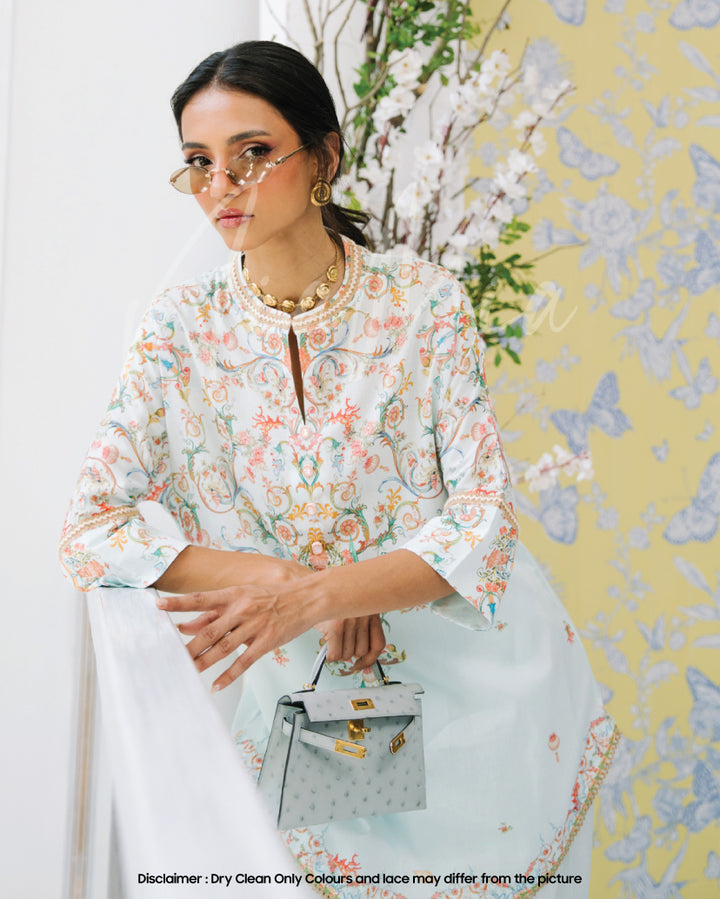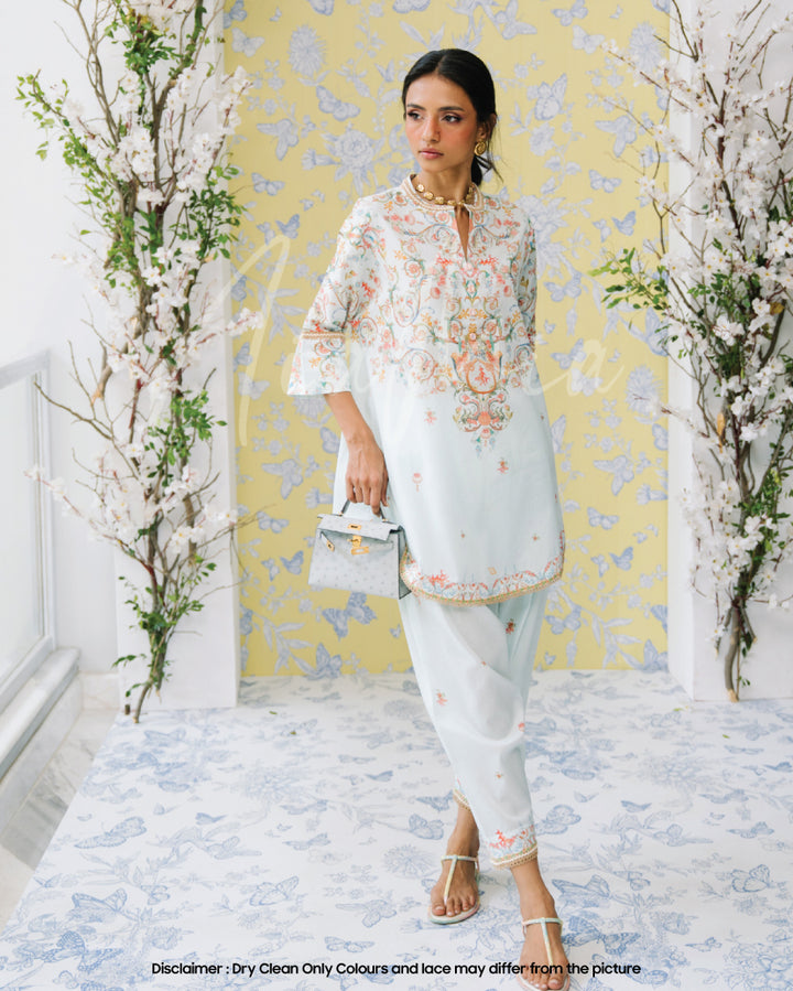 Ethereal and refined, this article captures the essence of spring with its soft pastel palette and ornate detailing. 🌸🕊️ Set against a soothing powder blue base, the ensemble blooms with intricate Rococo-inspired floral and vase motifs in coral, peach, and gold hues. 🪷✨