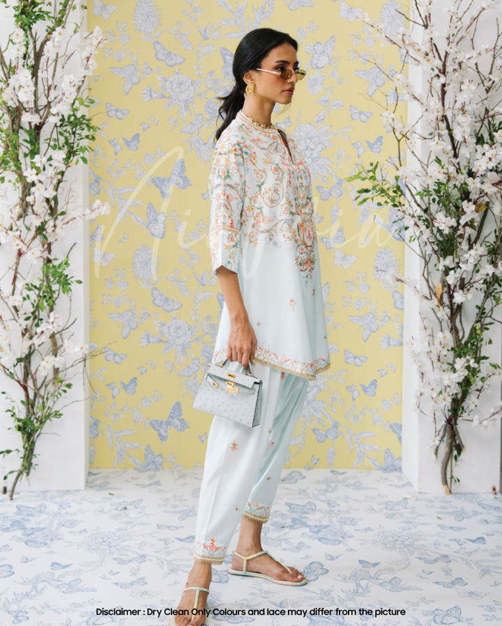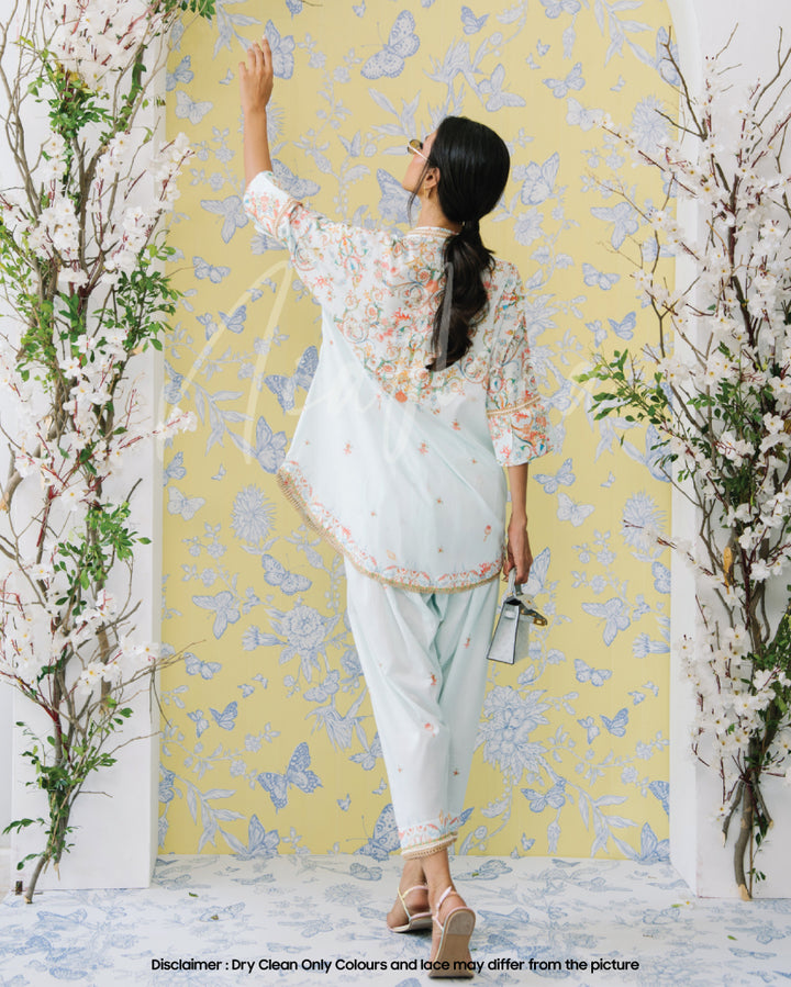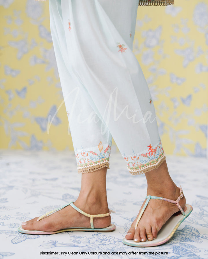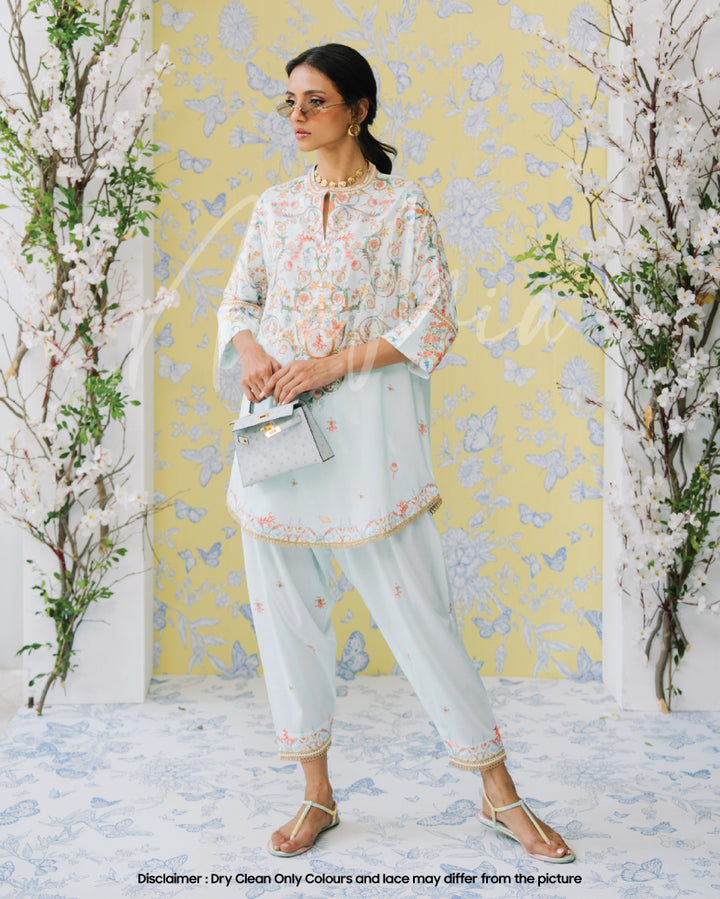 Miniature floral sprigs scatter across the trousers, bordered with embroidered cuffs that echo the kurta’s elegance.