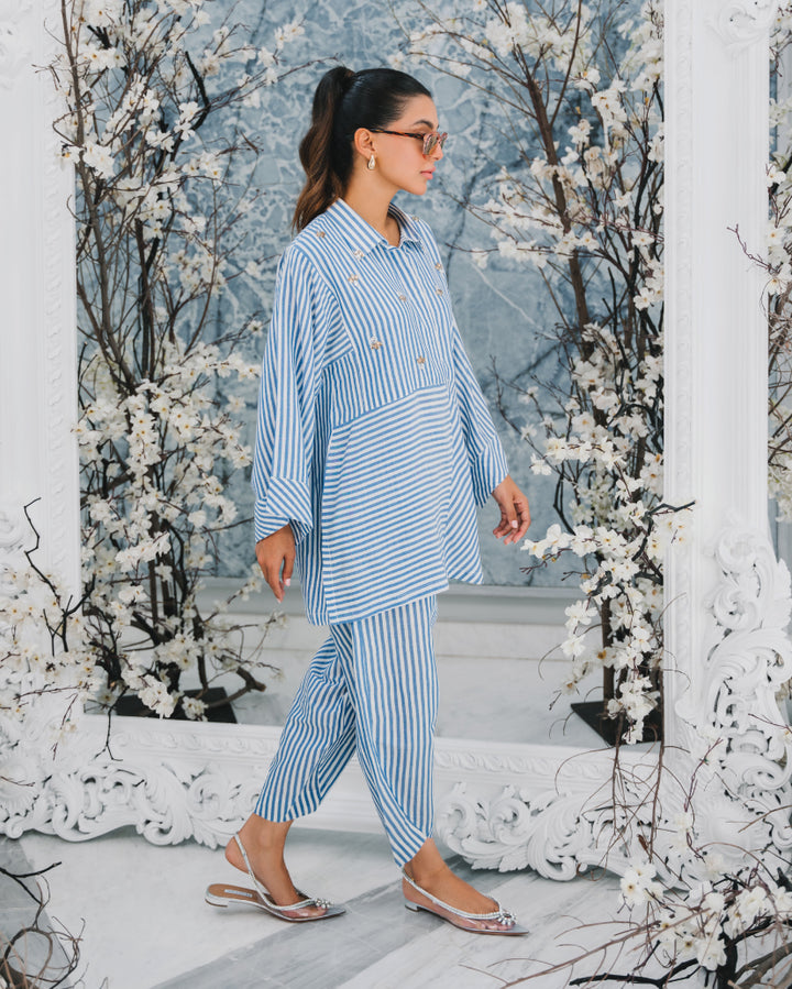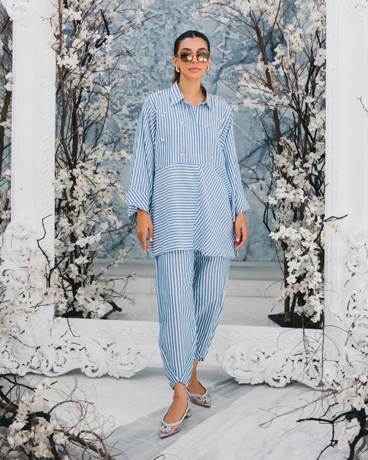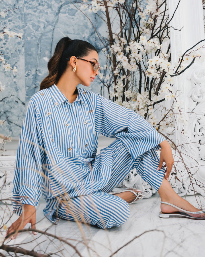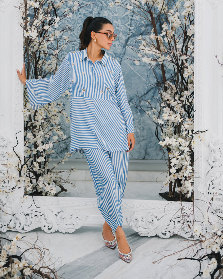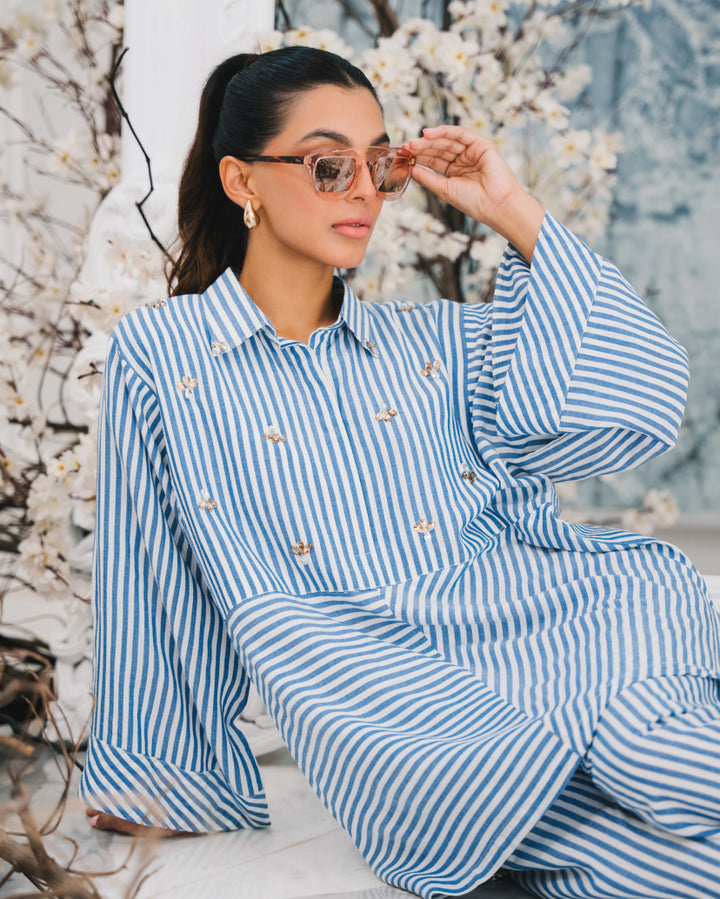 The Rhinestones Lines set features straight kumeez adorned with intricate rhinestone buttons along the bib of the kumeez paired with a collar. Paired with a classic NiaMia shalwar cut from the same material.