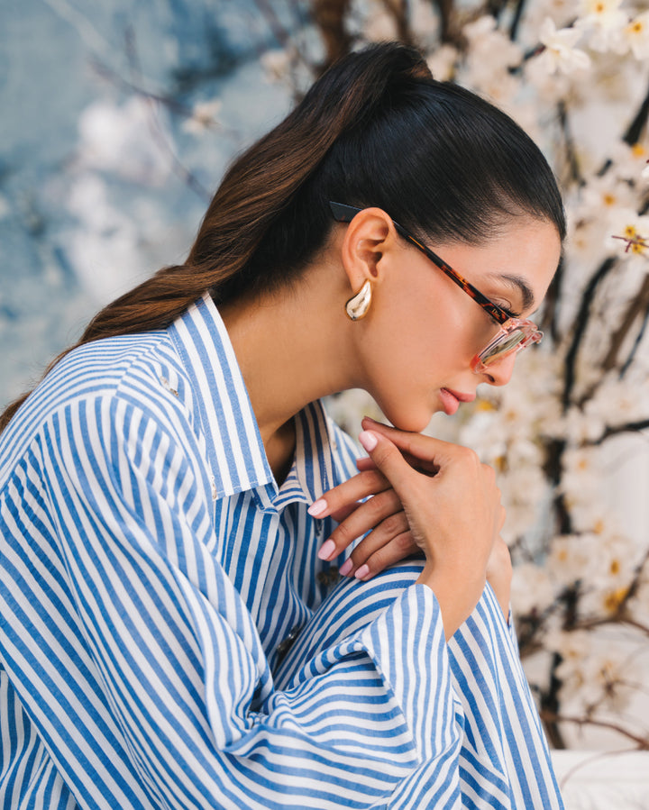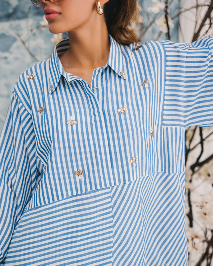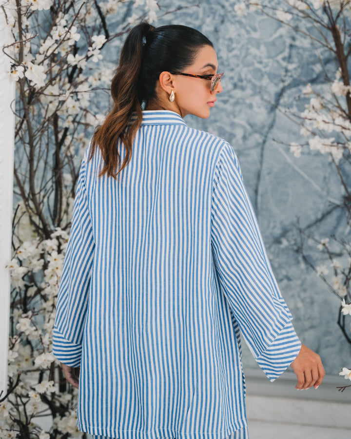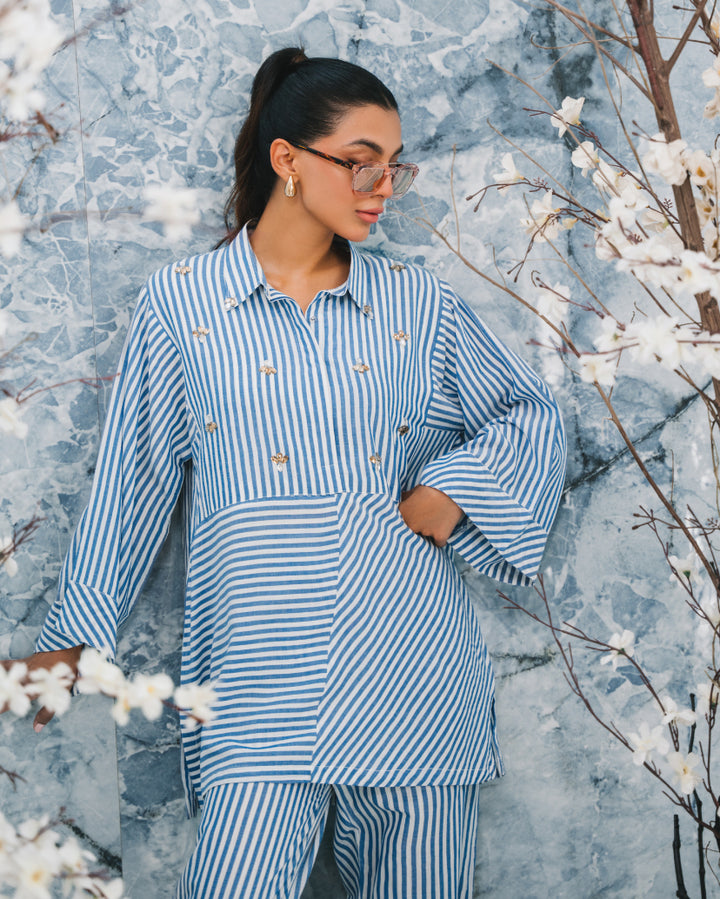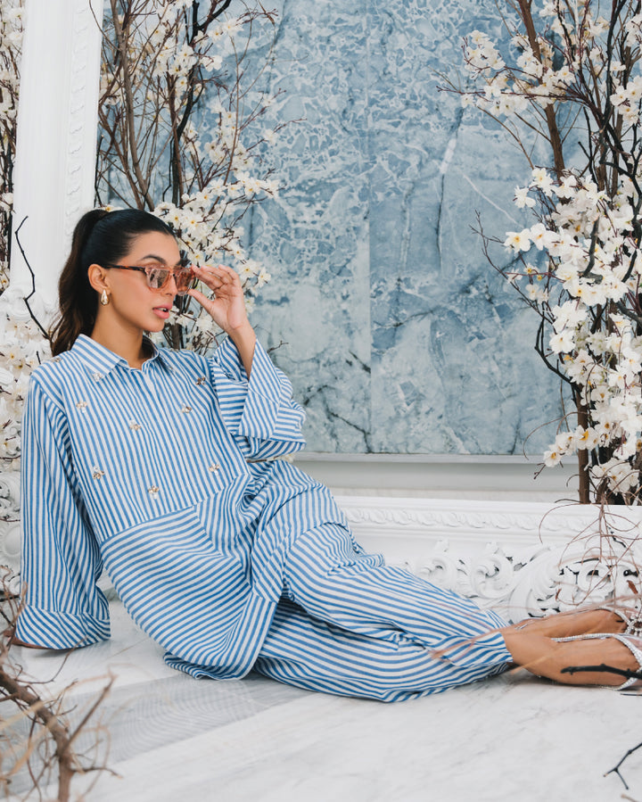 The Rhinestones Lines set features straight kumeez adorned with intricate rhinestone buttons along the bib of the kumeez paired with a collar. Paired with a classic NiaMia shalwar cut from the same material.