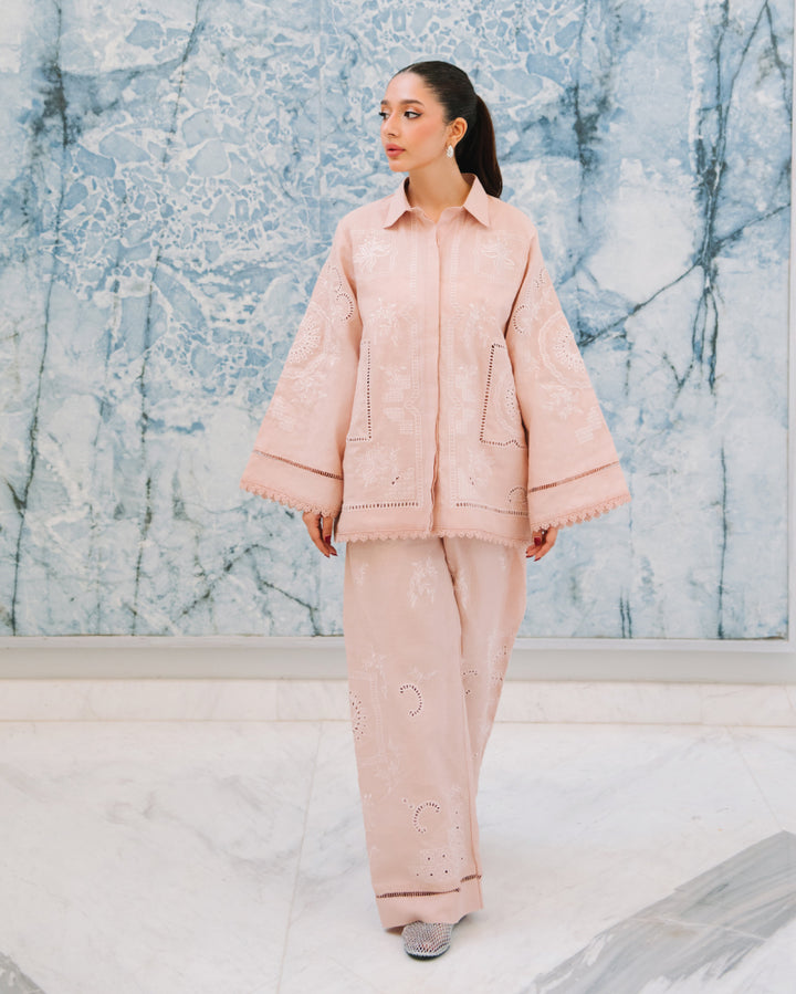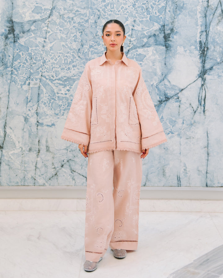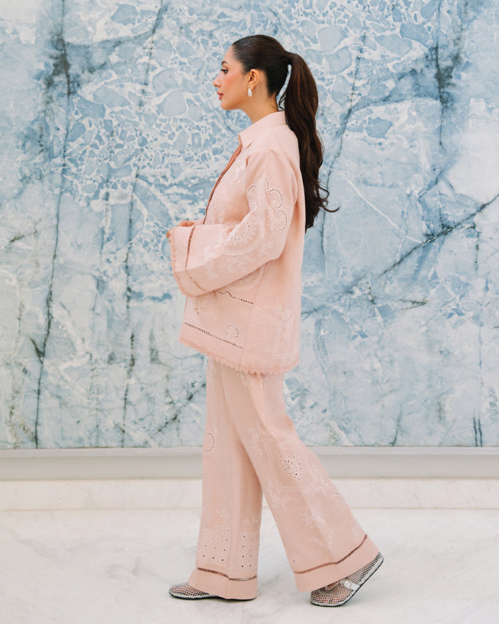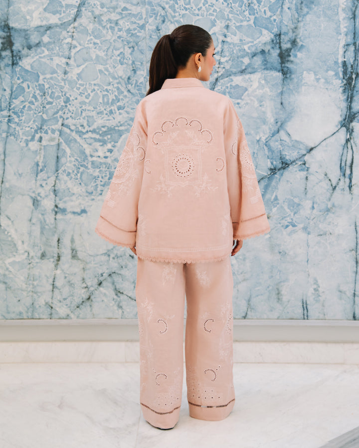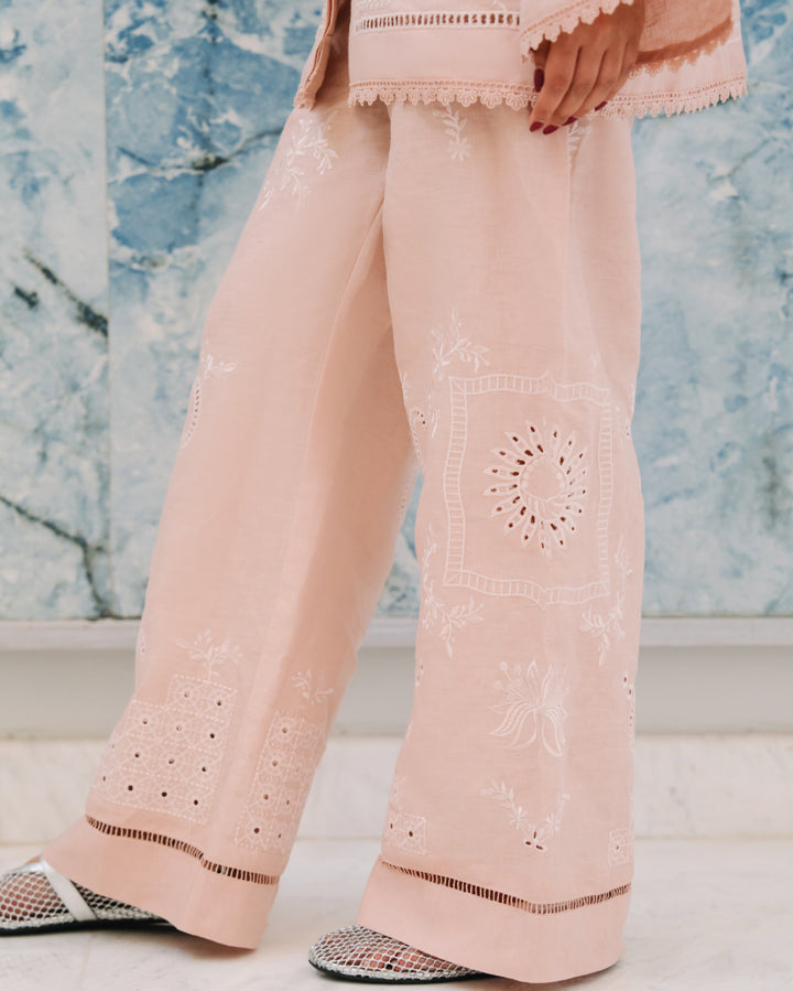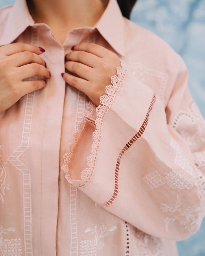 This shirt is crafted from 100% Irish linen. This set features a button down shirt and a collar, along with cutwork and embroidery, finished with matching lace inserts. The pant is cut from the same material adorned with embroidery and cutwork finished with matching lace inserts.