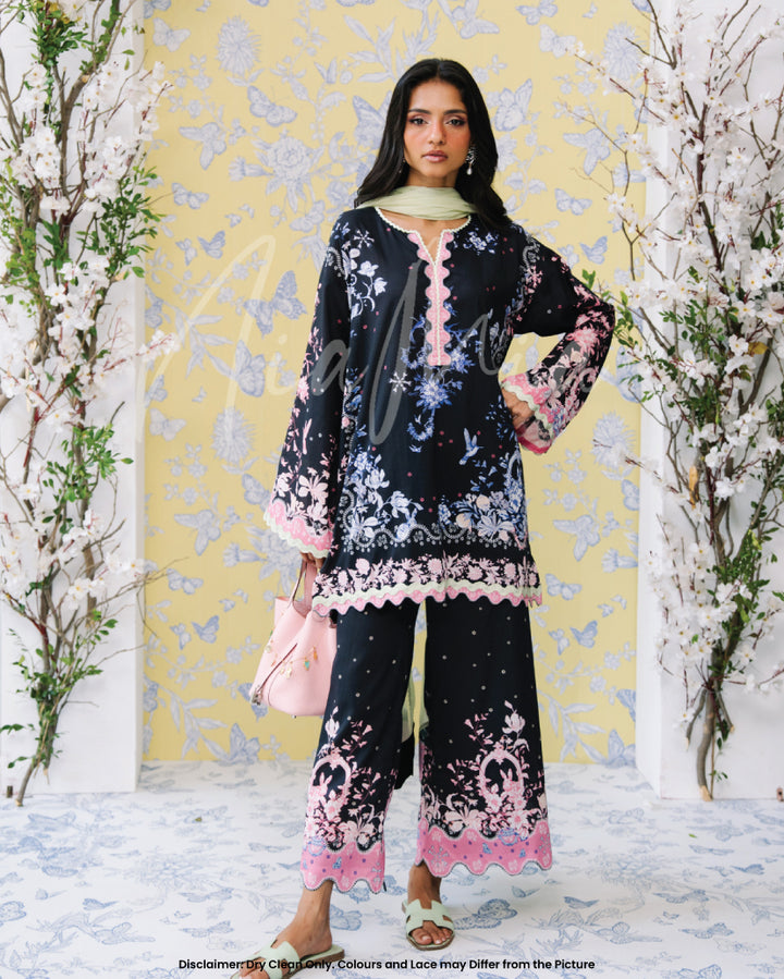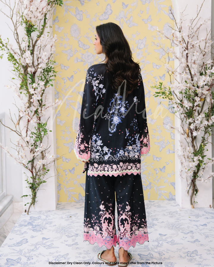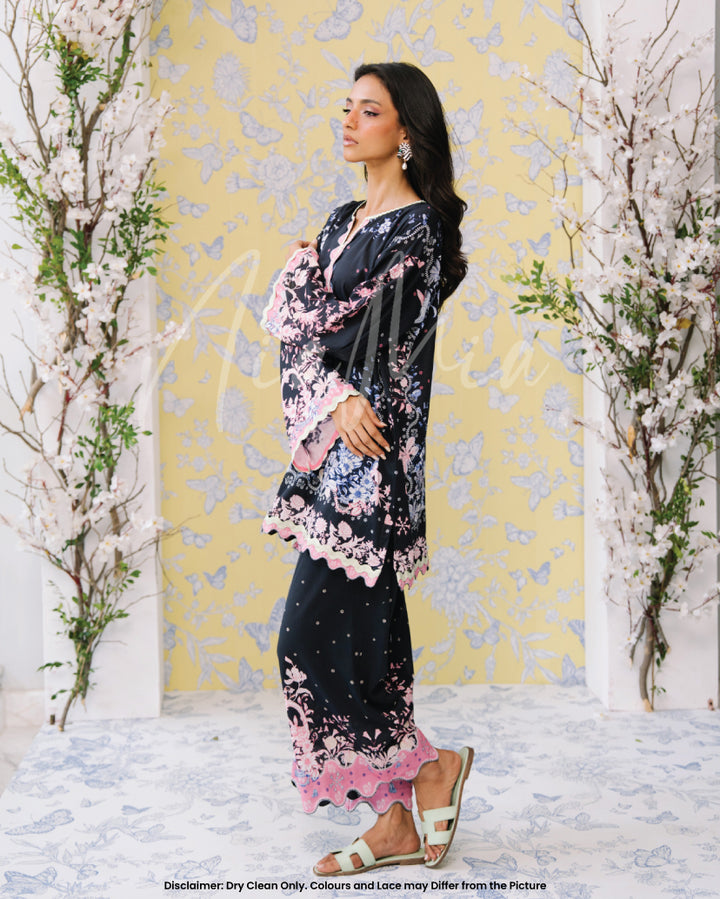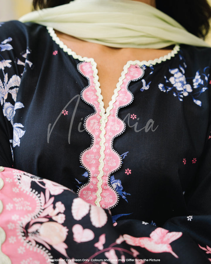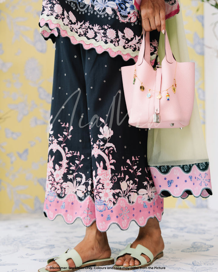 This ensemble is adorned with delicate pastel pink florals and scalloped embroidery that dances across the fabric like moonlight on petals 🌷✨.