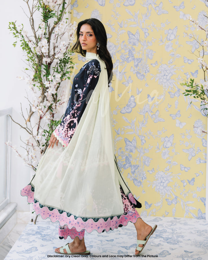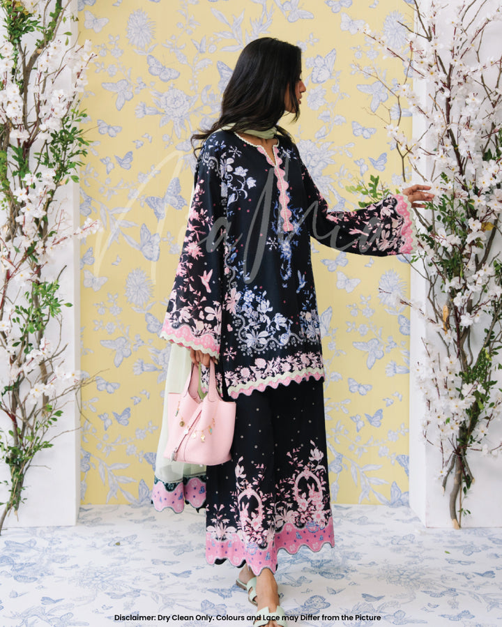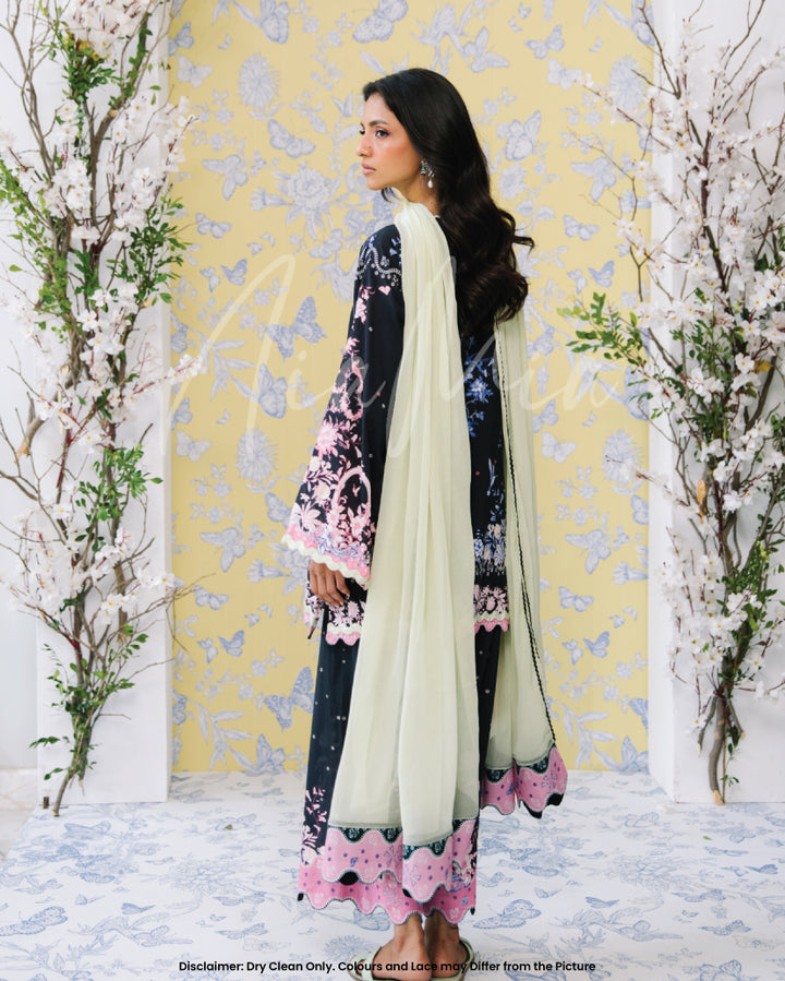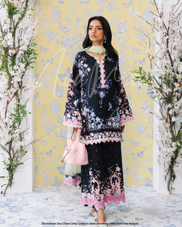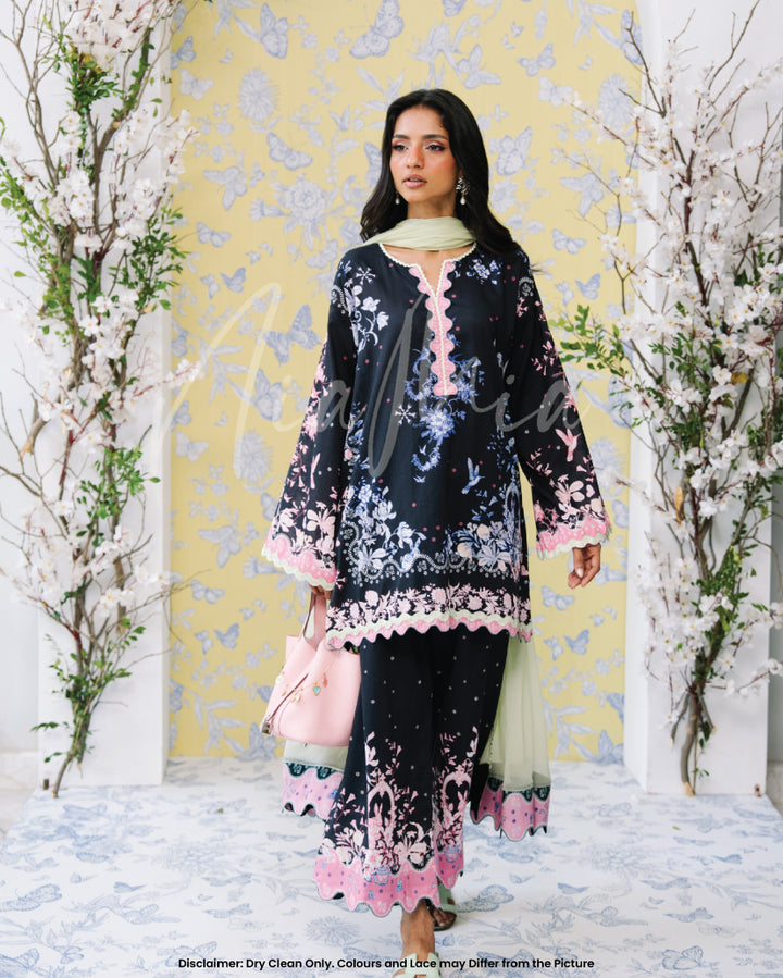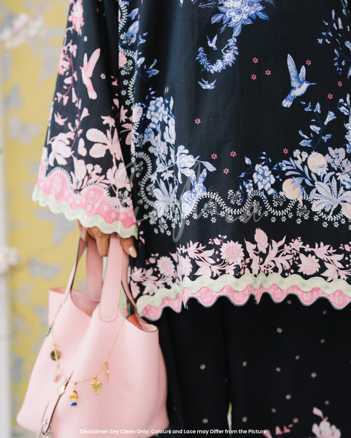 This ensemble is adorned with delicate pastel pink florals and scalloped embroidery that dances across the fabric like moonlight on petals 🌷✨.