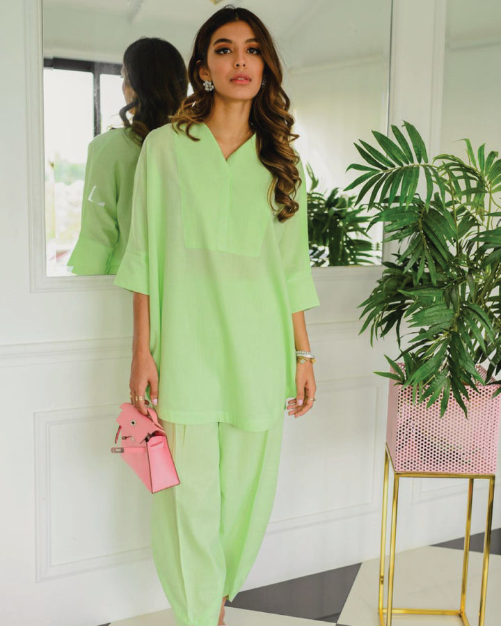 The Verde Apple Set, designed in the Classic NiaMia cut with a twist, is a wardrobe essential! This co/ord set includes our loose fitting kameez and shalwar with our signature neck detailing, made from breezy cotton linen sourced locally.