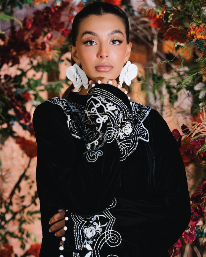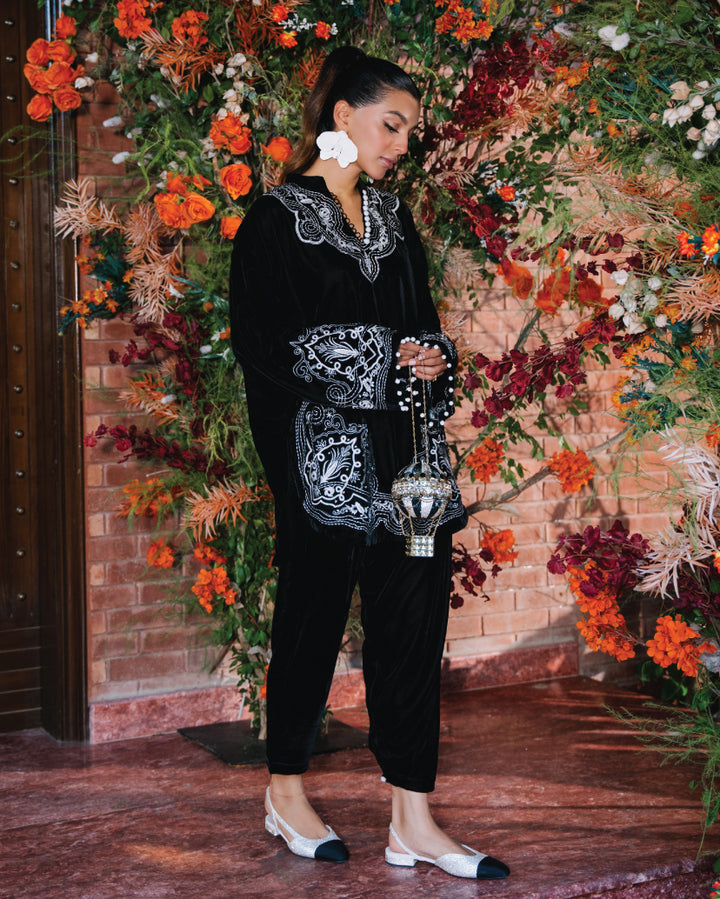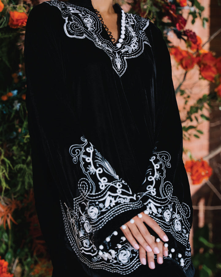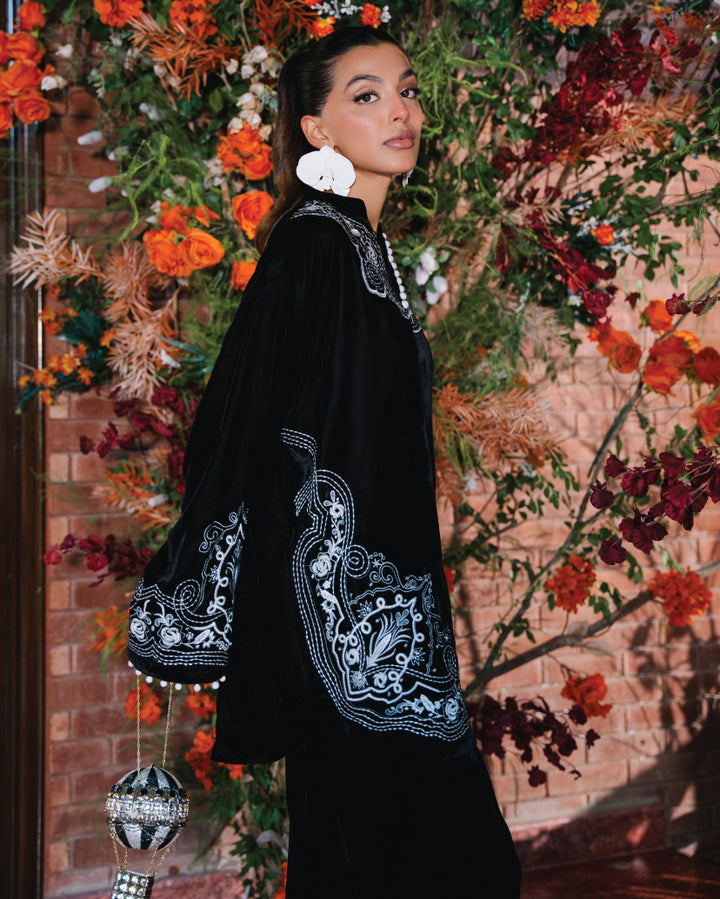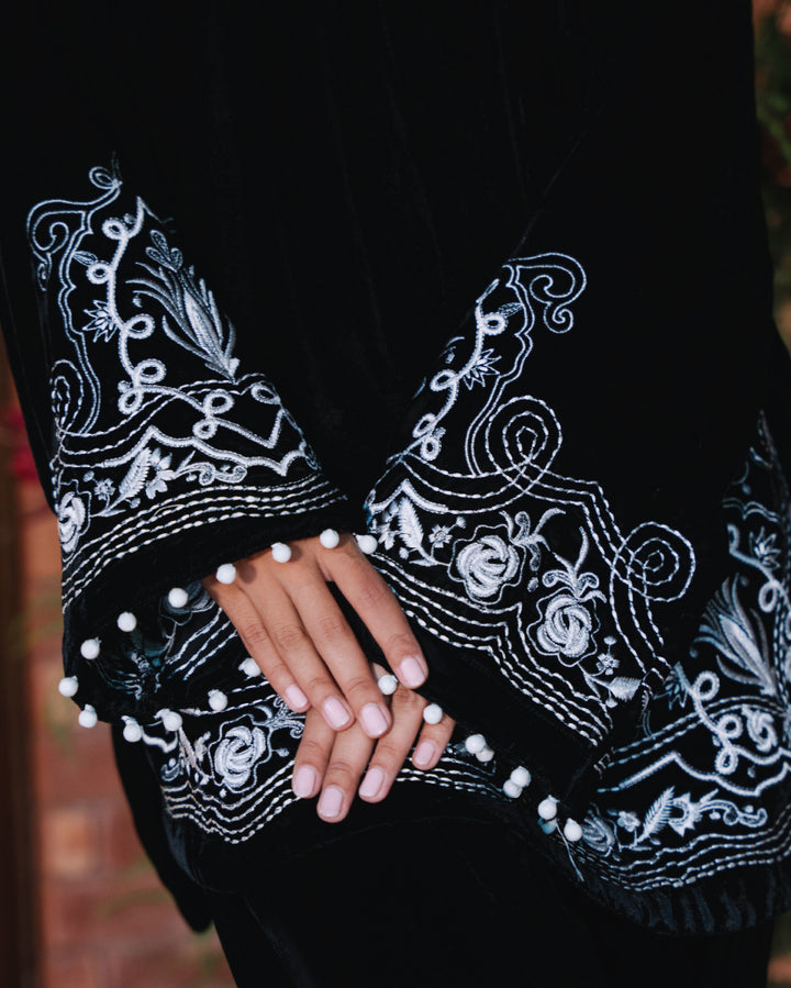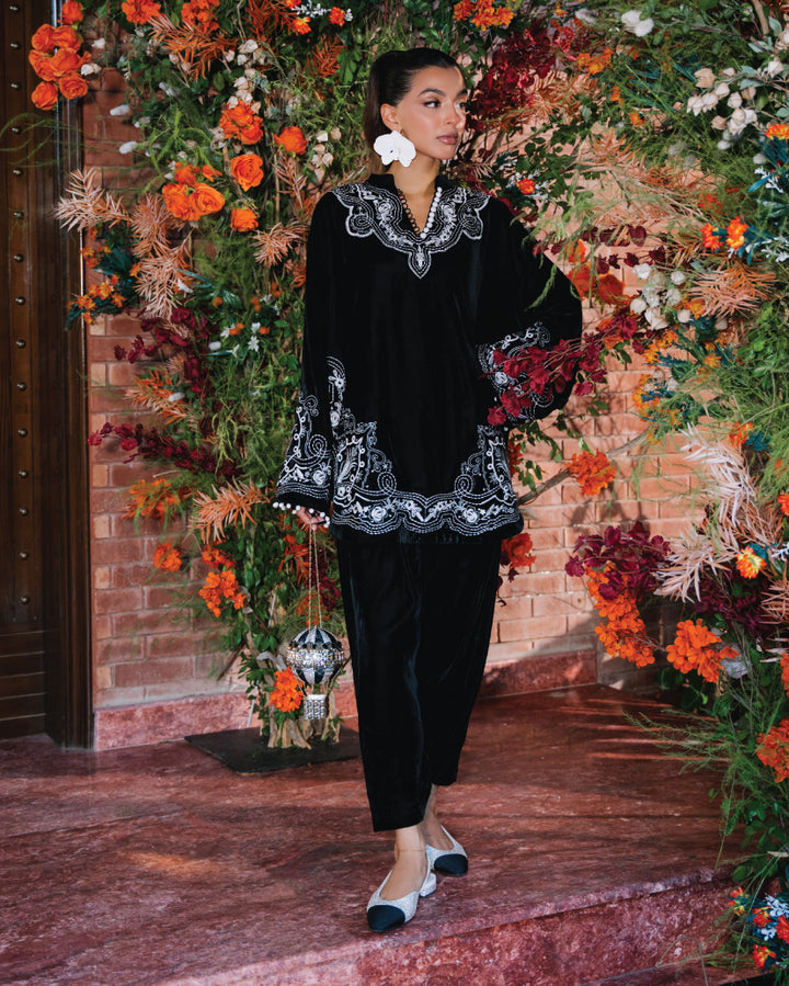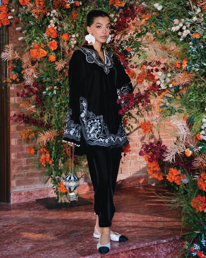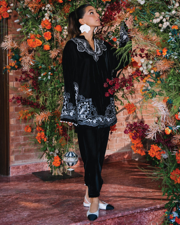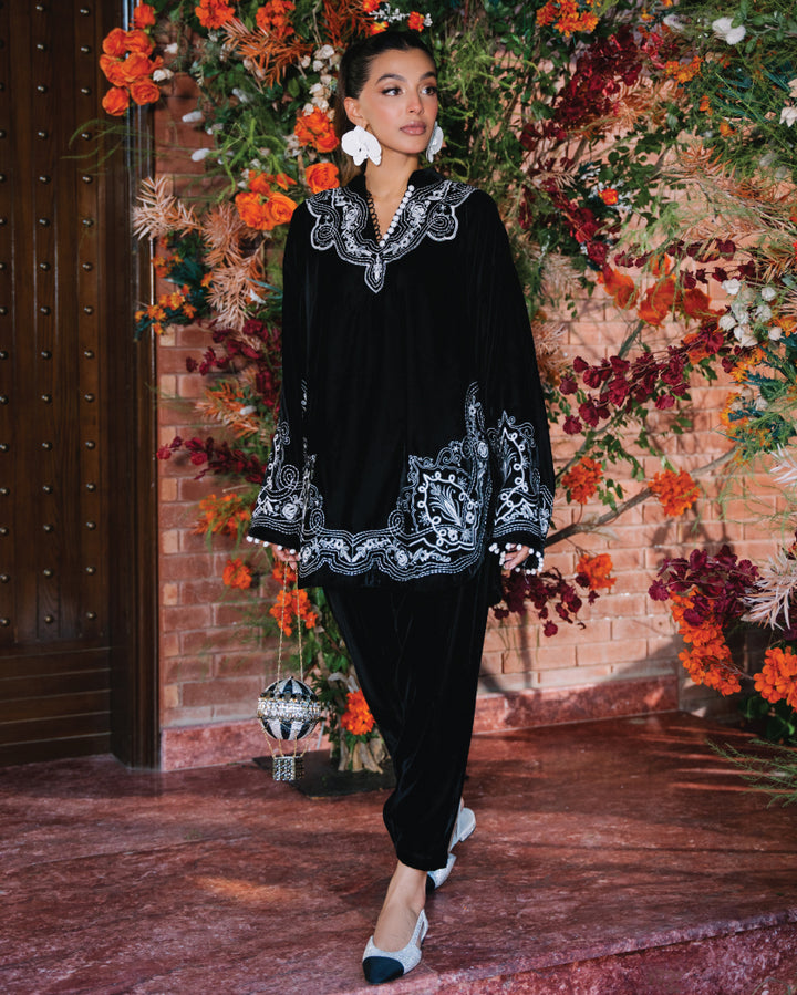 The Vino B designed in a classic short kumeez is a part of the Winter Edit’24. This set includes our loose-fitting kameez cut from Velvet, adorned with intricate white coloured embroidery on the shirt, and includes our signature skinny shalwar all cut from locally sourced velvet.