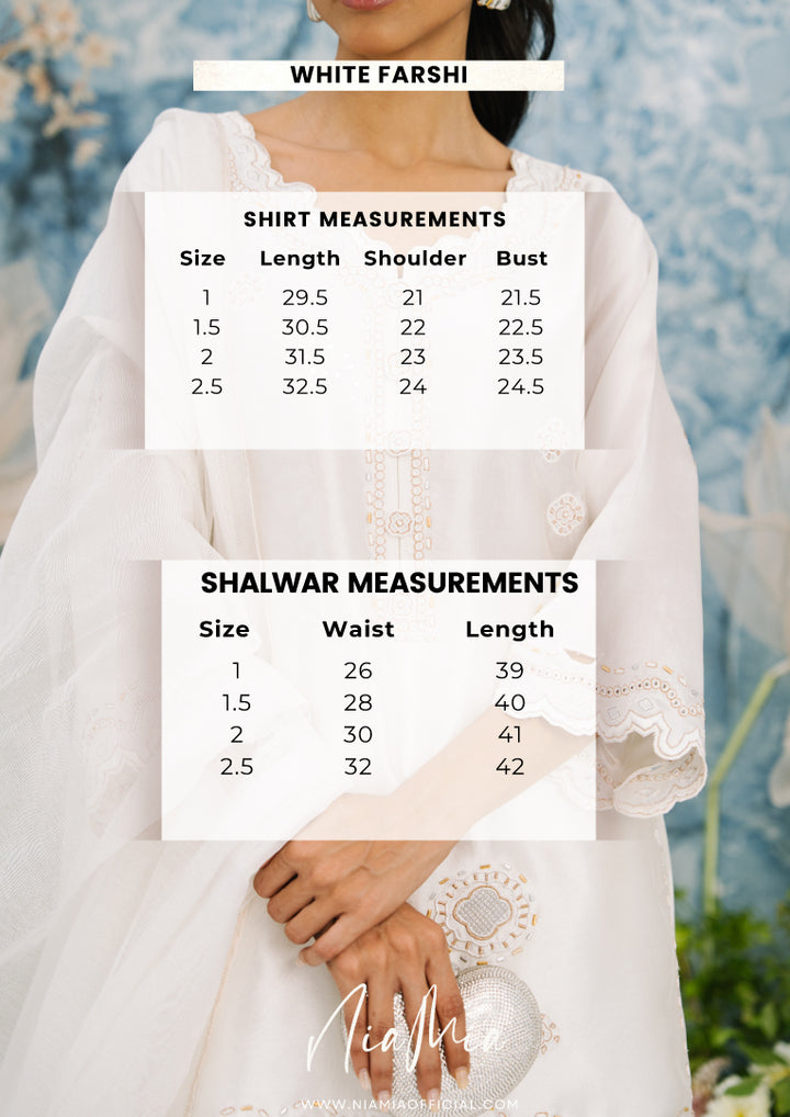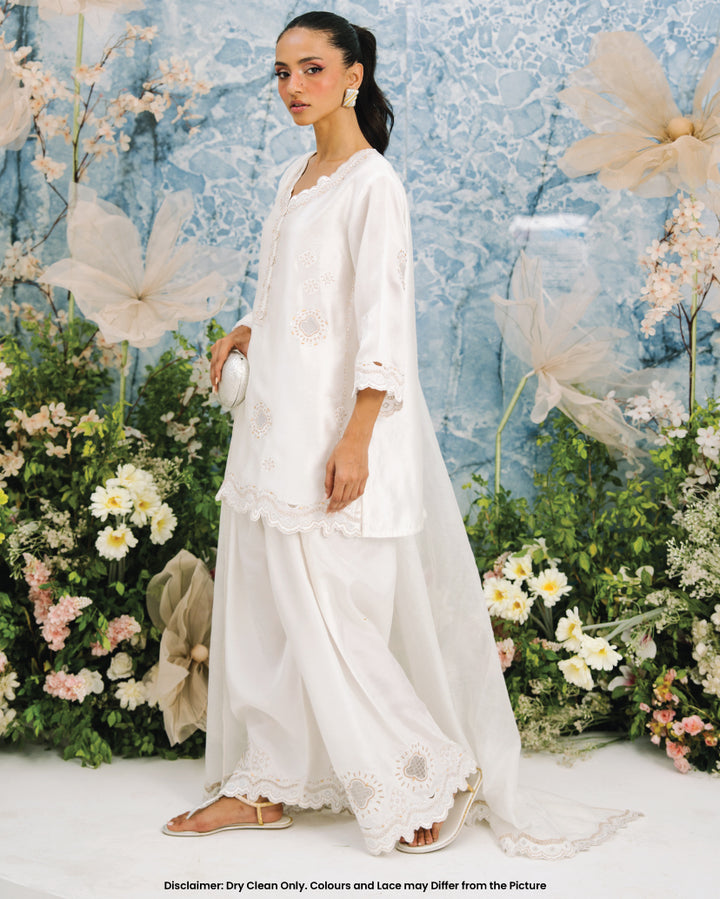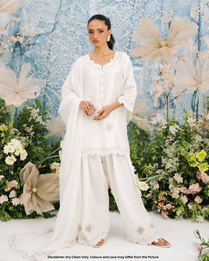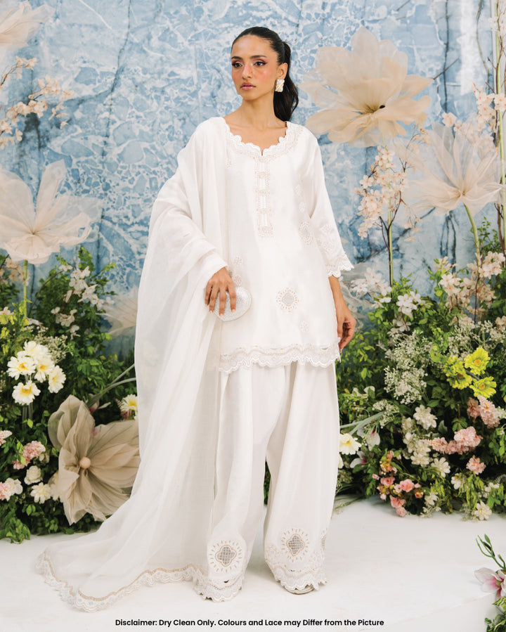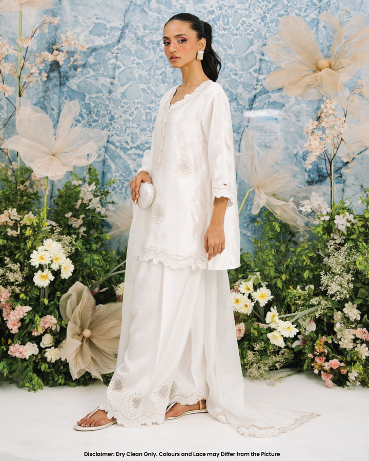 This White Farshi set includes a stunning sheesha silk shirt adorned with intricate metalic flower design motifs. The neckline features 3d flower buttons and cutwork along the hem. The farshi shalwar features raw silk material adorned with similar embroidery.