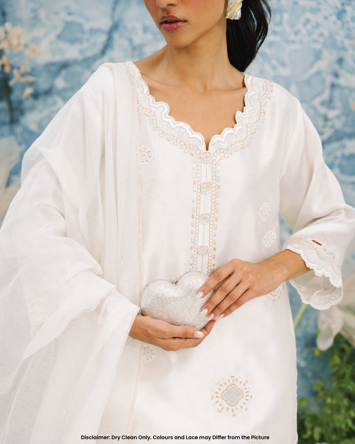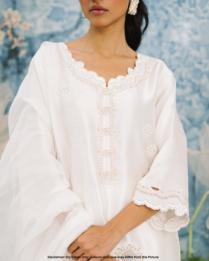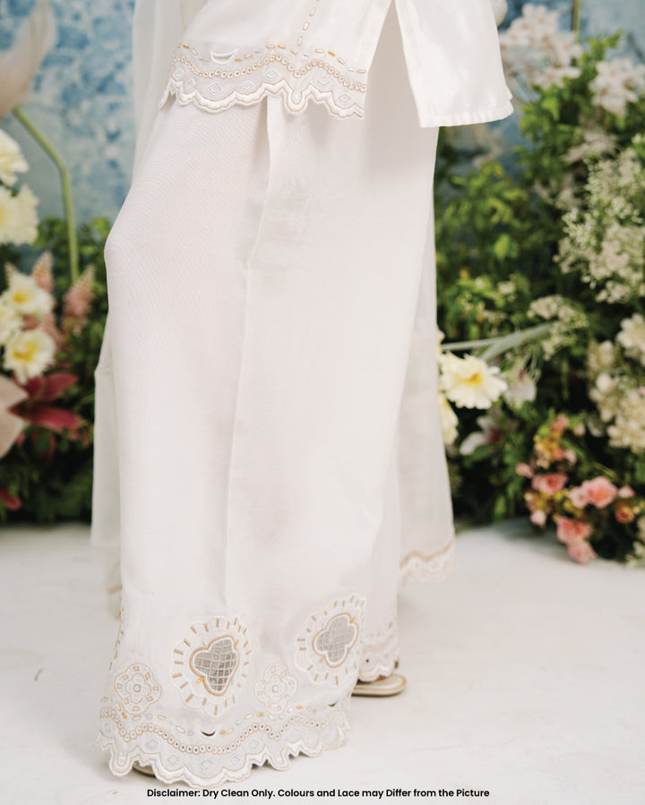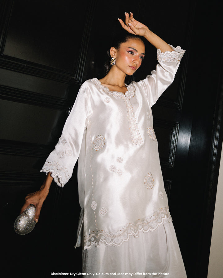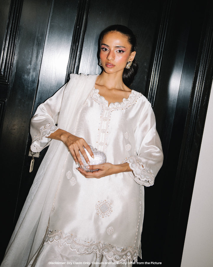 This White Farshi set includes a stunning sheesha silk shirt adorned with intricate metalic flower design motifs. The neckline features 3d flower buttons and cutwork along the hem. The farshi shalwar features raw silk material adorned with similar embroidery.